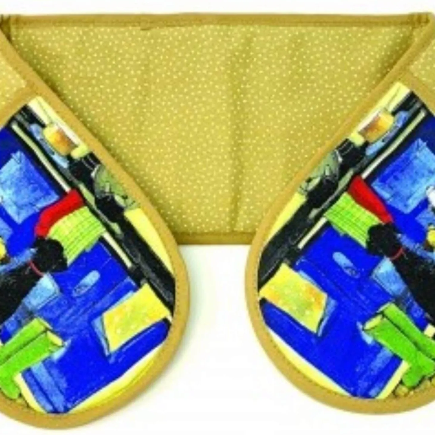 Part of the Alex Clark range, these lovely oven gloves have a mustard yellow spotted design with beautiful illustrations of a trio of dogs in front of a range cooker warming themselves. These oven gloves will bring colour into your kitchen and protect your hands at the same time as you bake.