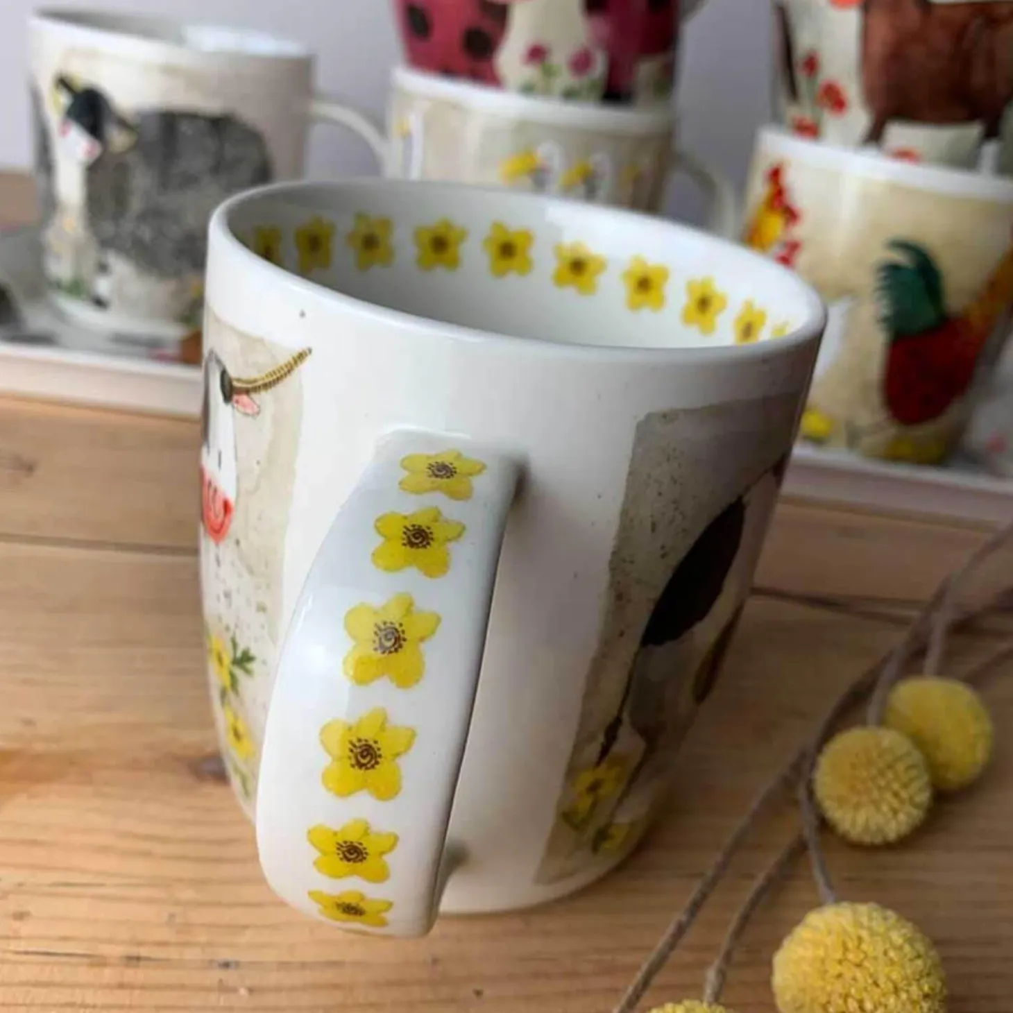 A lovely way to start your day with a tea or coffee in this lovely ‘Dorothy’ Alex Clark mug. This mug features a delightful illustration by Alex Clark of a gorgeous cow amongst bright yellow flowers, with more flowers around the inner rim and down the handle. Perfect for your favourite hot drink.