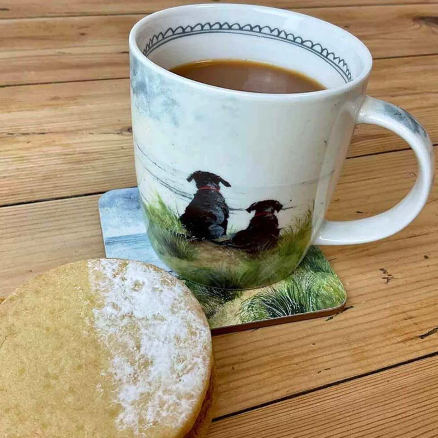 A lovely way to start your day is with tea or coffee in this lovely Alex Clark mug. This mug features a delightful illustration by Alex Clark of two dogs sitting in the sand dunes looking out to sea, there are decorations around the inner rim and also down the handle. Perfect for your favourite hot drink.