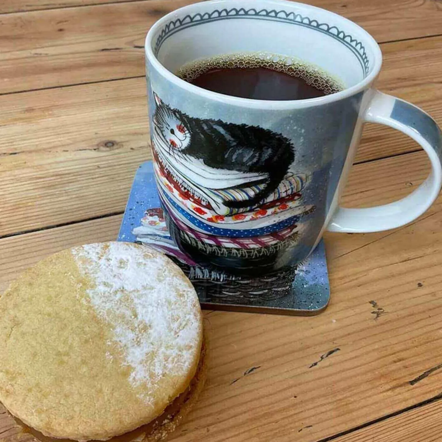 A lovely way to start your day is with tea or coffee in this lovely Alex Clark mug. This mug features a delightful illustration by Alex Clark of a cat asleep on top of folded washing in a laundry basket, there are decorations around the inner rim and also down the handle. Perfect for your favourite hot drink.