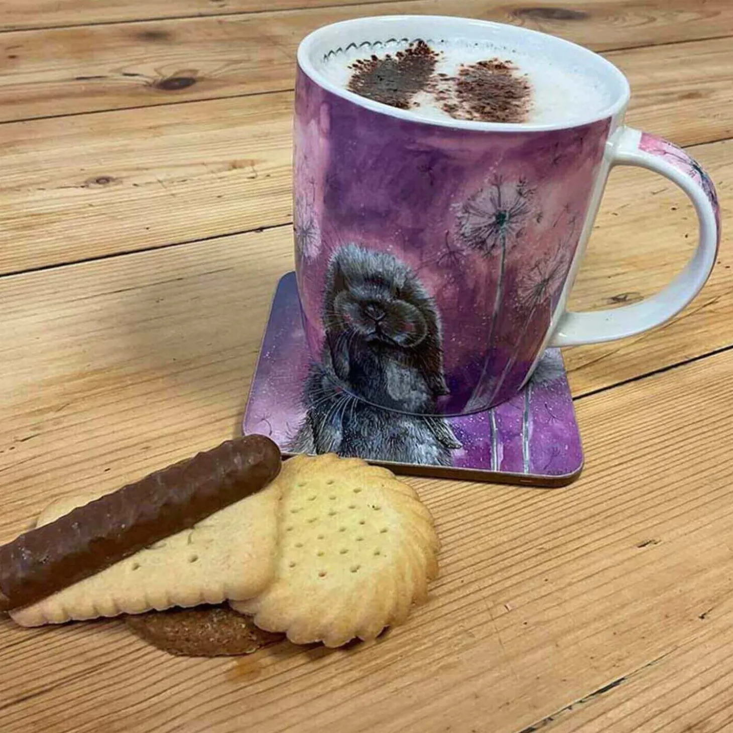 A lovely way to start your day with a tea or coffee in this lovely Alex Clark mug. This mug features a delightful illustration by Alex Clark of a cute rabbit on a purple background, there are decorations around the inner rim and also down the handle. Perfect for your favourite hot drink.