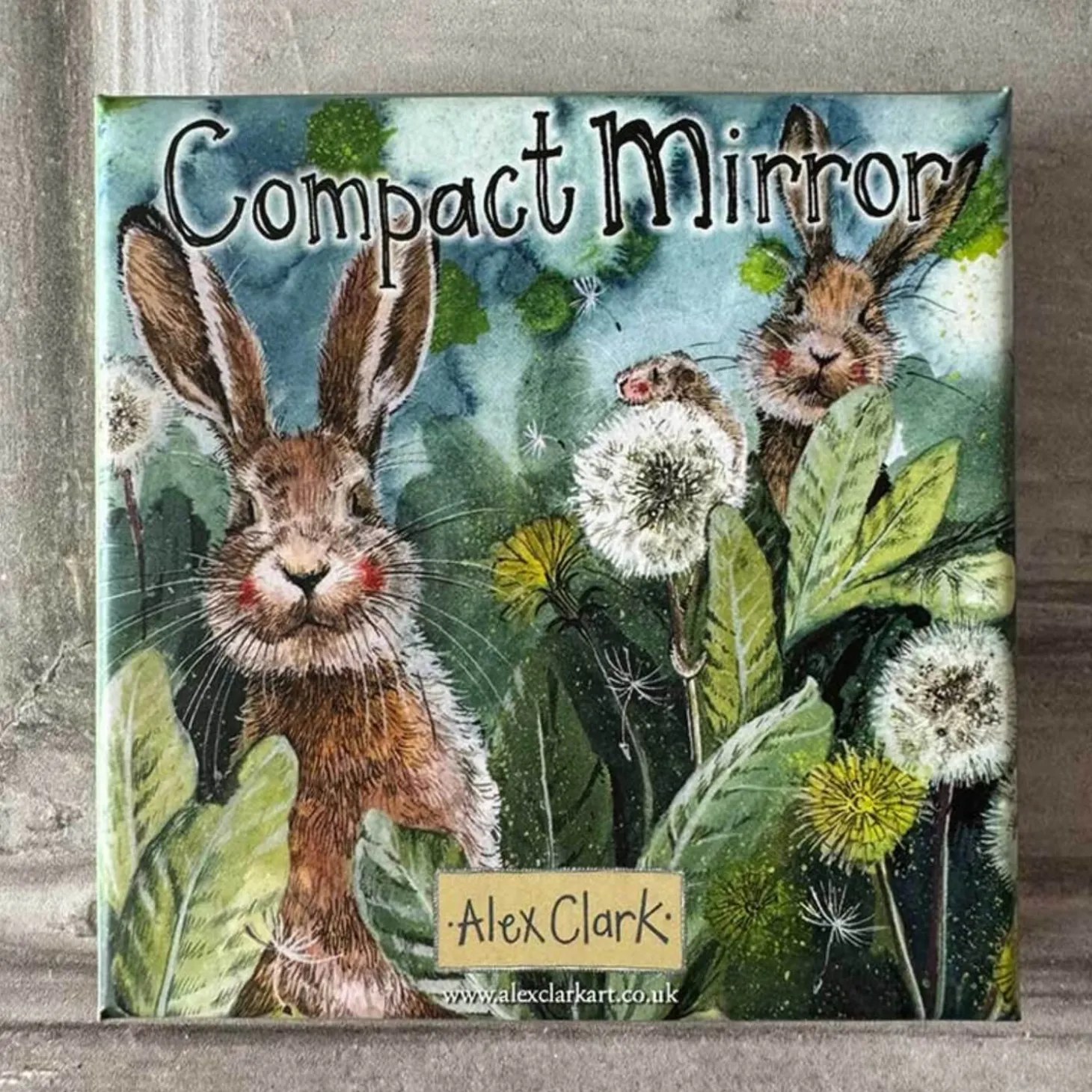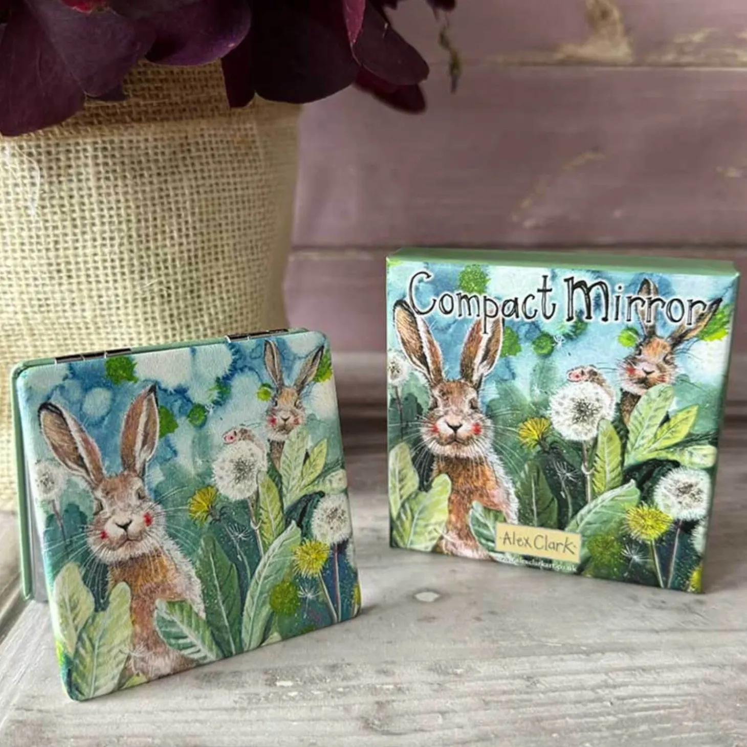 Alex Clark presents the ‘Little Rabbits’ Vegan Leather Compact Mirror, a perfect blend of fun and practicality for your everyday needs. Featuring a double mirror, this compact is illustrated with two cheerful bunnies playing amongst the dandelions, inspired by the English countryside and Alex’s love for animals. The soft vegan leather not only adds a touch of luxury but is also a cruelty-free and eco-conscious alternative to traditional leather. Presented in a matching gift box, this charming compact would make a lovely gift or special treat for yourself!