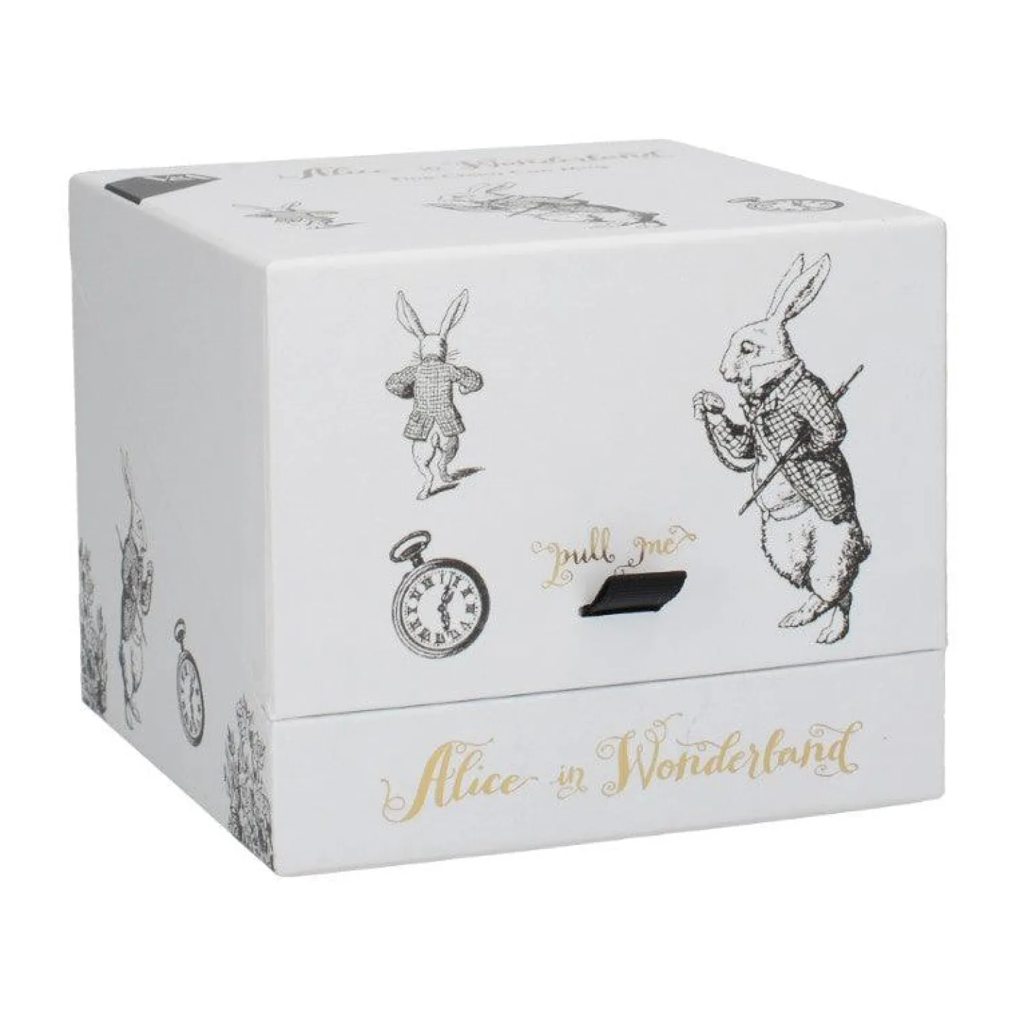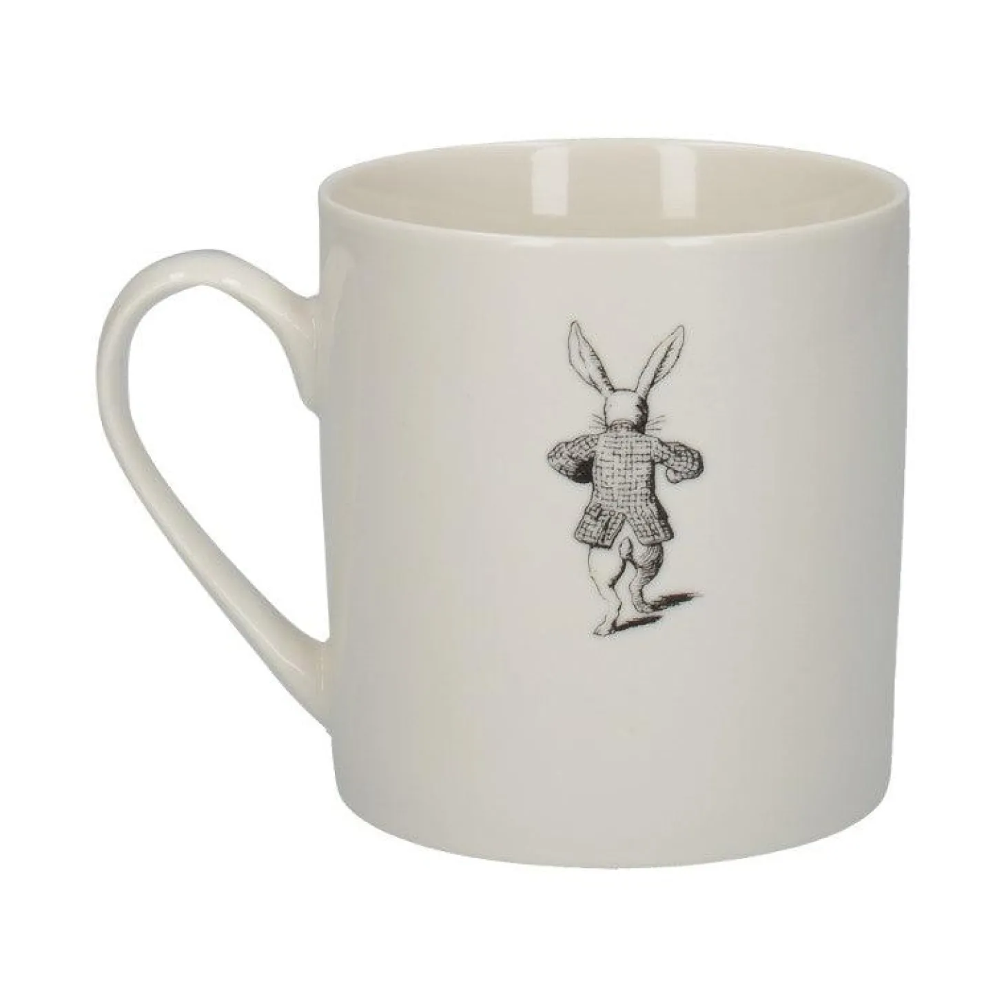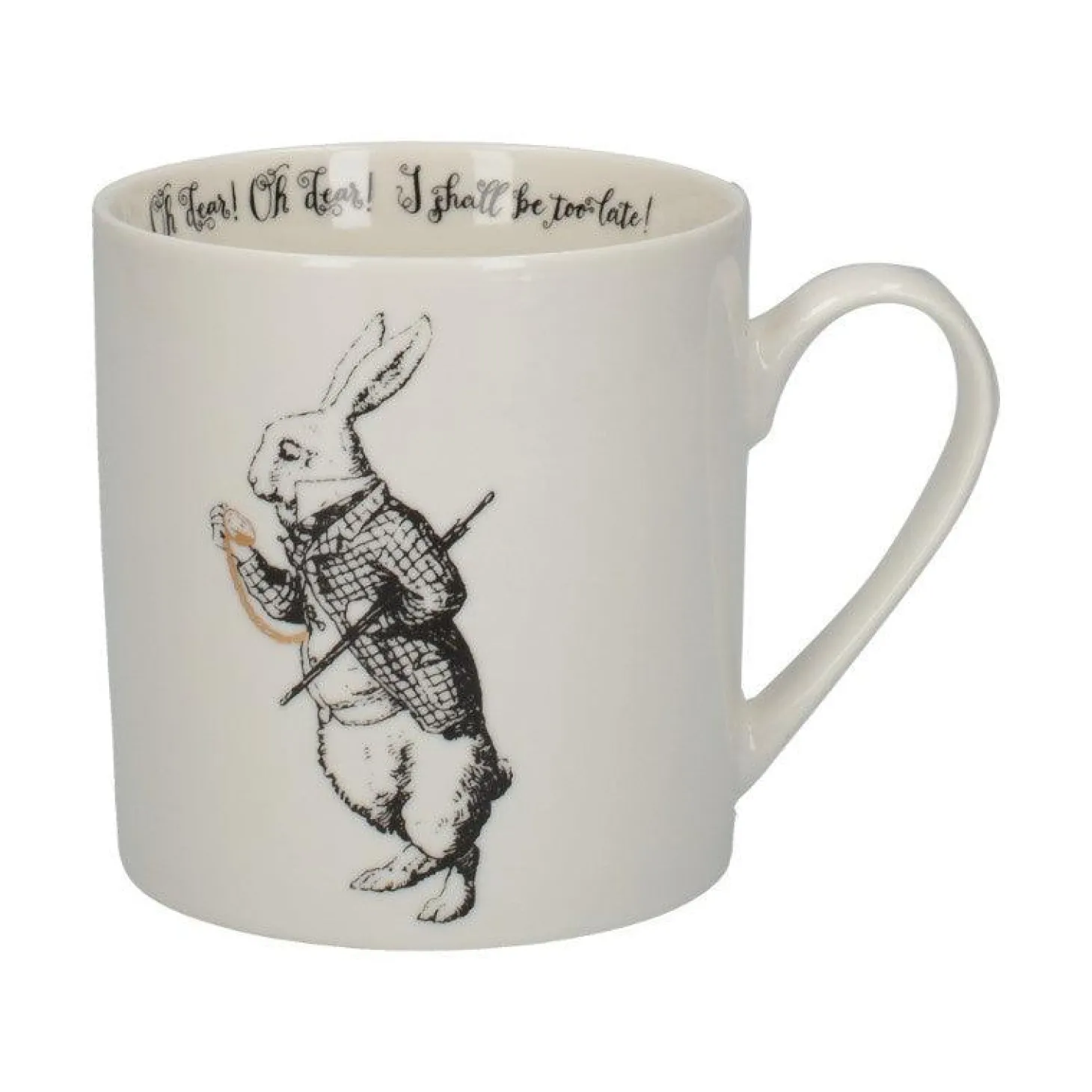This beautiful Alice in Wonderland mug is a perfect addition for afternoon tea. Having been carefully crafted from fine china it features delicate character illustrations that have been taken from the original Alice in Wonderland book, each illustration is in black and white with a touch of luxury gold. This mug features two illustrations on the exterior which depict the White Rabbit inspecting his pocket watch on the front and another illustration of the White Rabbit running away on the reverse side. There is also another two illustrations on the inside of the mug depicting a pocket watch at the base and the famous quote ‘Oh dear! Oh dear! I shall be too late!’ which surrounds the rim.