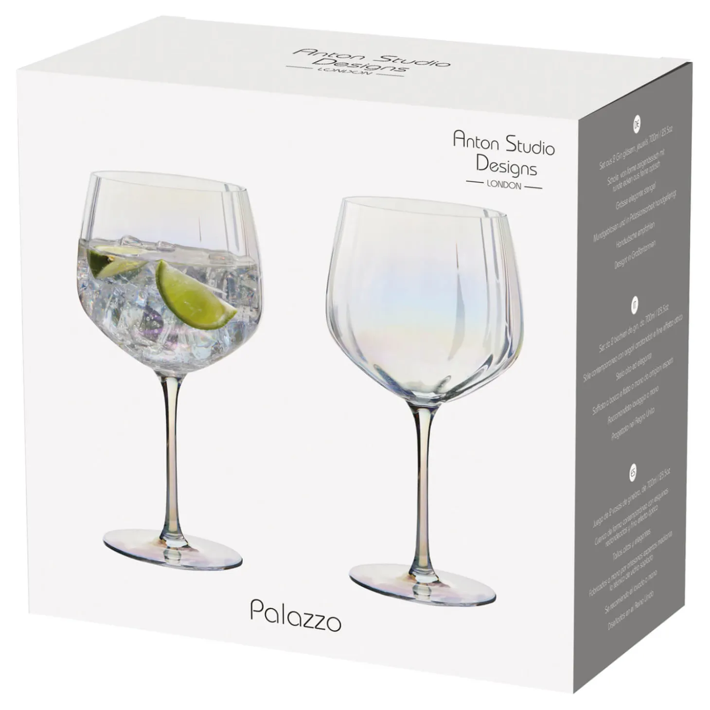 Designed in the UK by Anton Studio Designs London, these beautiful Palazzo Gin Glasses are mouth-blown and handcrafted by skilled craftsmen making them unique as well as lovely to look at. Running vertically within the bowl of each glass is a broad open optic, bringing shape and style letting in light in such a way as to display the stunning but subtle pearlescent finish which adorns each glass. These glasses would make a truly lovely gift or a treat for yourself.