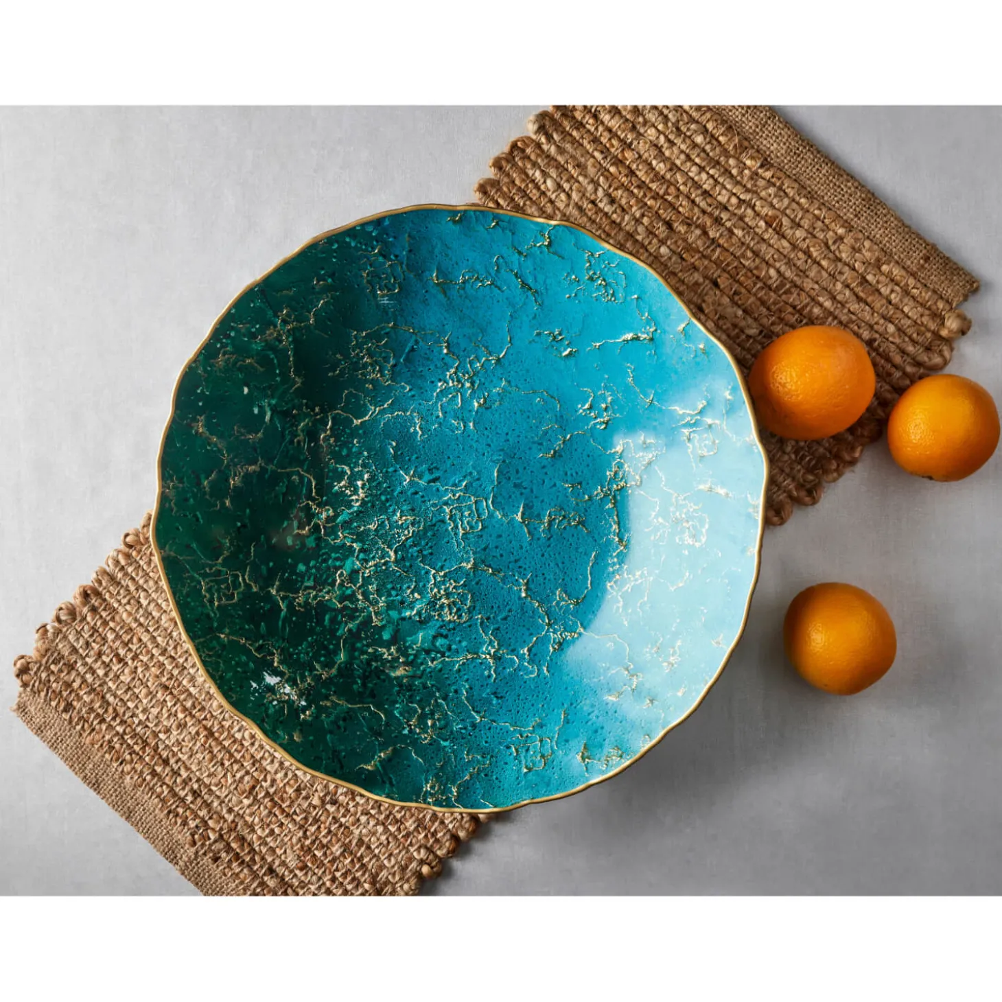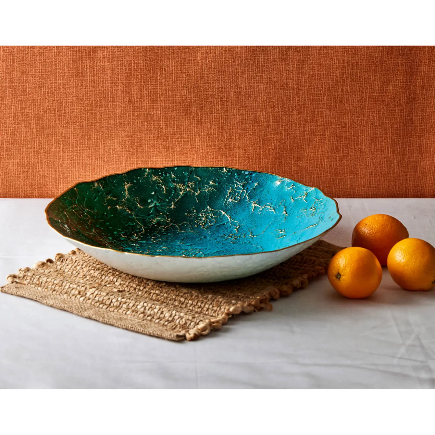 Anton Studios Designs London presents this stunning Marbled Lagoon Bowl. This elegant bowl is made of hand-painted glass, gorgeous shades of blue, turquoise and green with gold edging and gold threads throughout the design. It will look great in any room of your home, whether you use it practically for holding fruit, potpourri, or purely for decoration. This beautiful bowl would make a lovely gift or a treat for yourself.