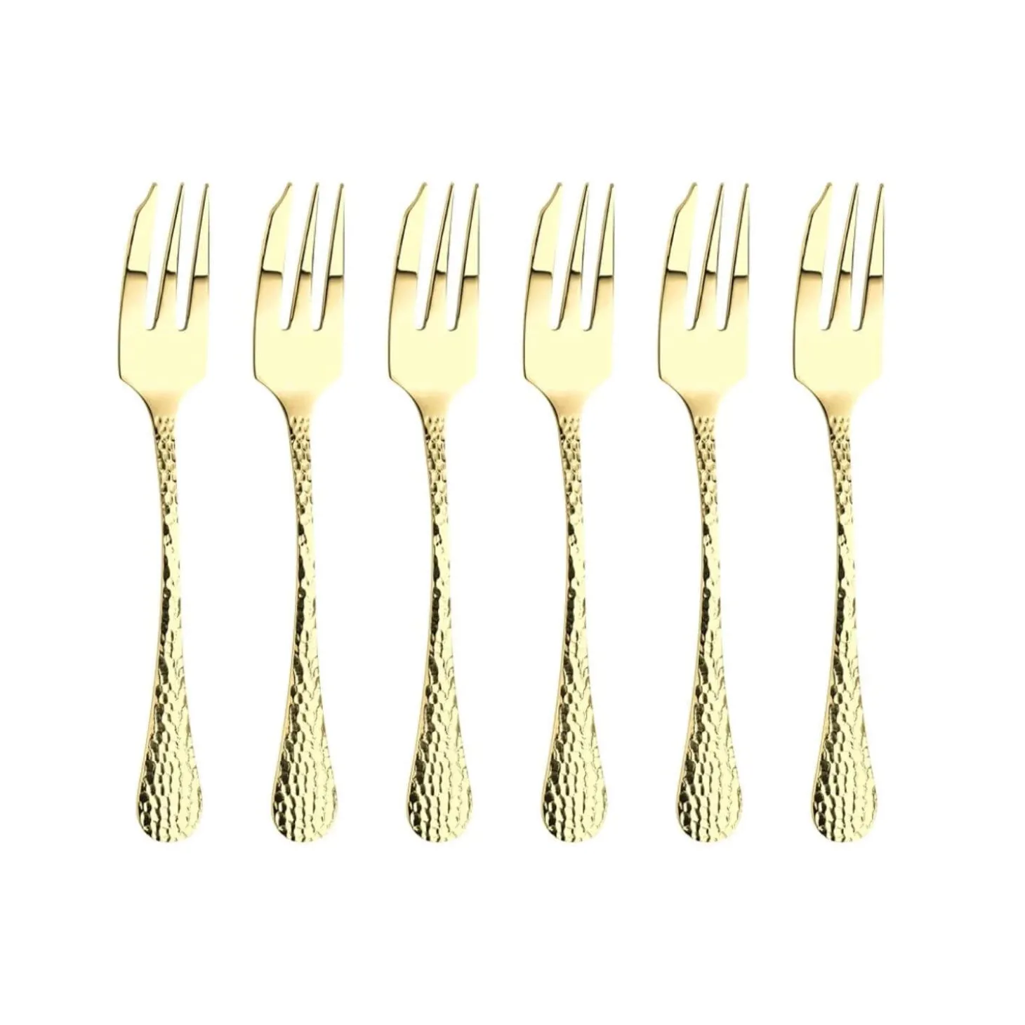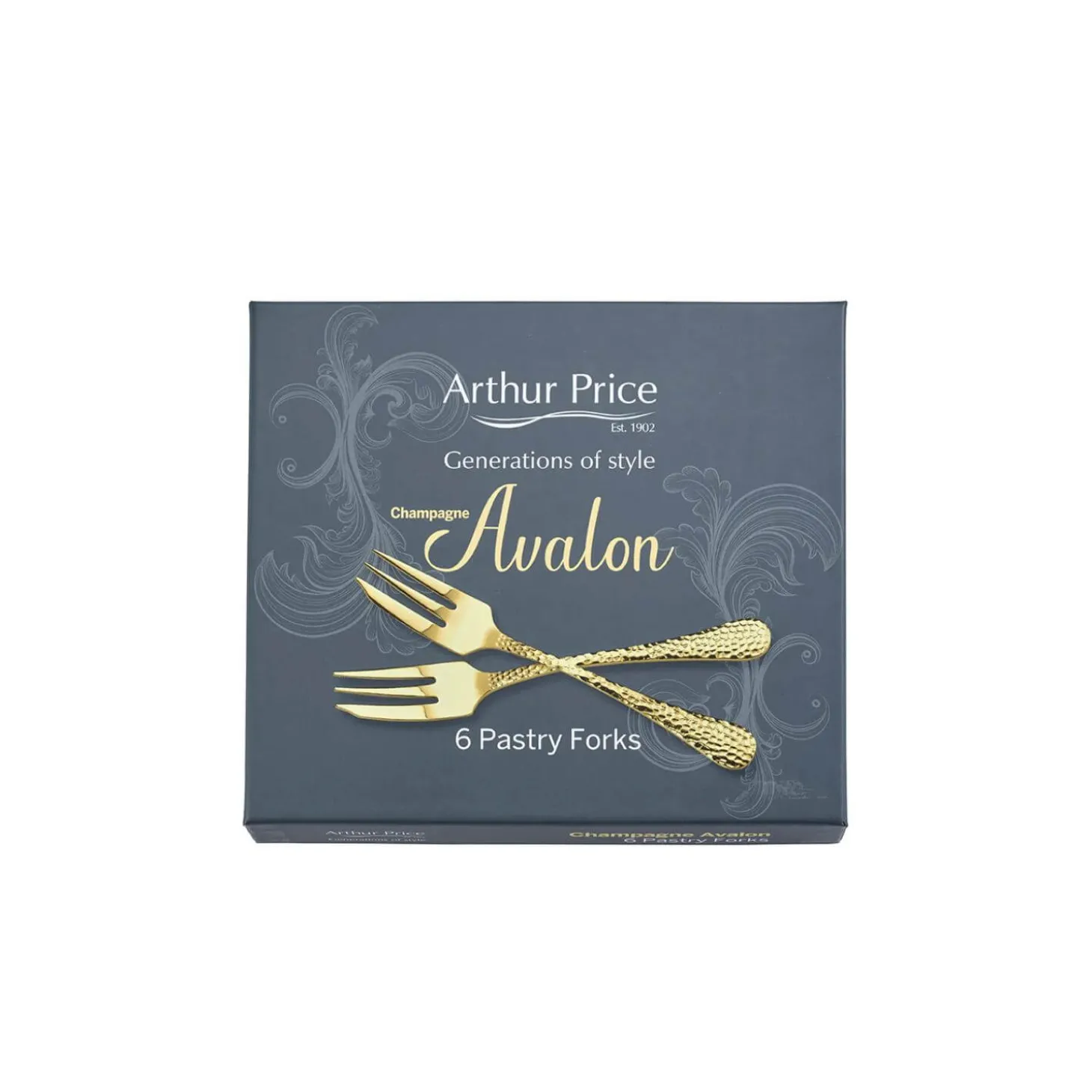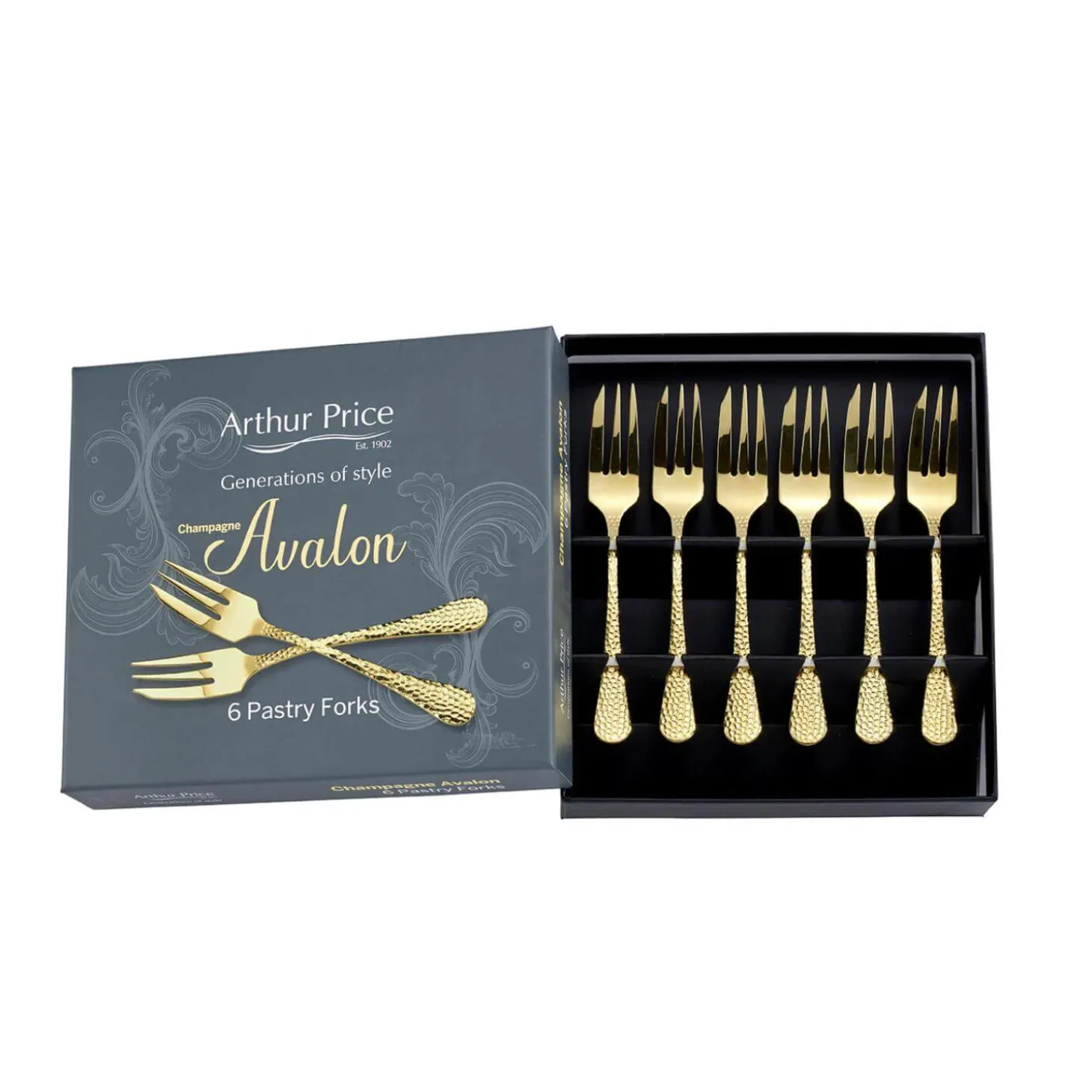 Arthur Price presents the Avalon Set of 6 Pastry Forks in Champagne, beautifully crafted from the finest 18/10 Sovereign Stainless Steel using the very best chromium and nickel in a gold finish. This stylish set, with its hammered handles flaring towards the end, will certainly add a touch of elegance to your dining table.