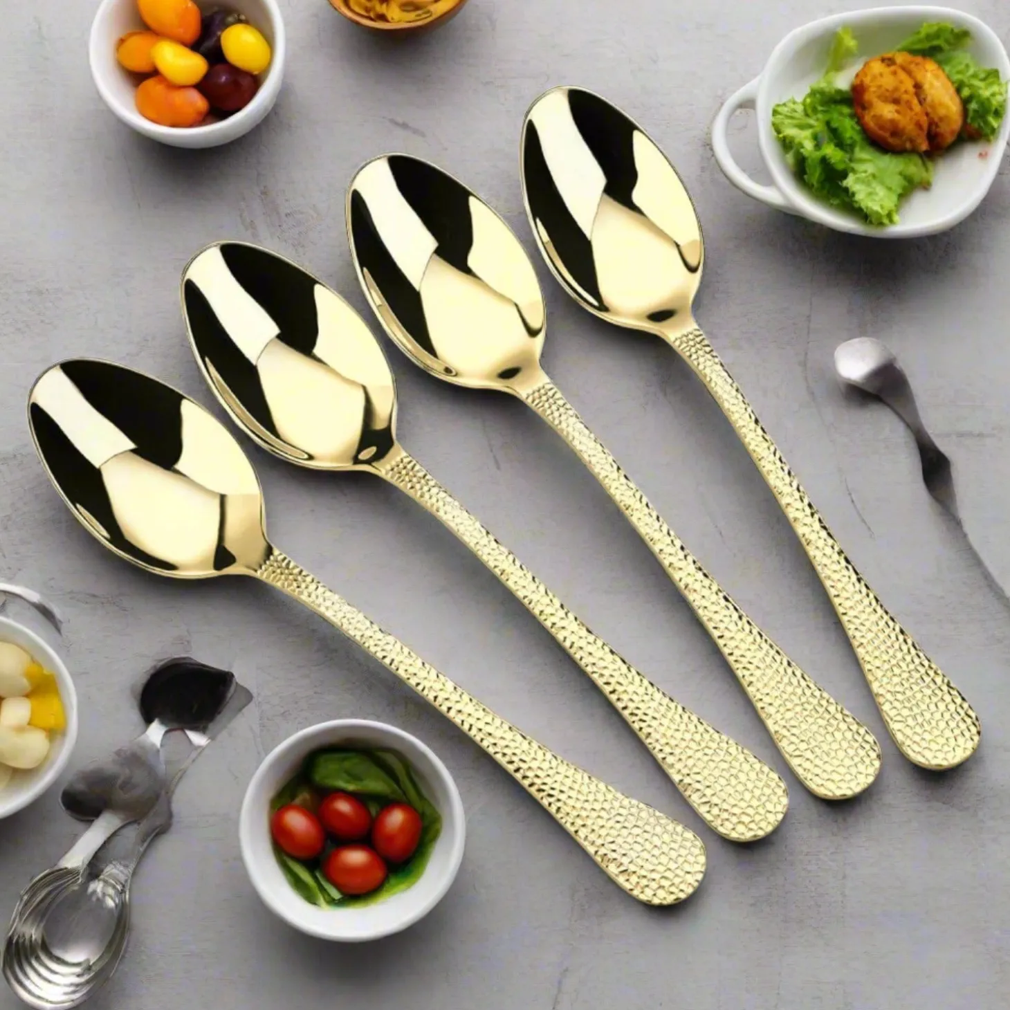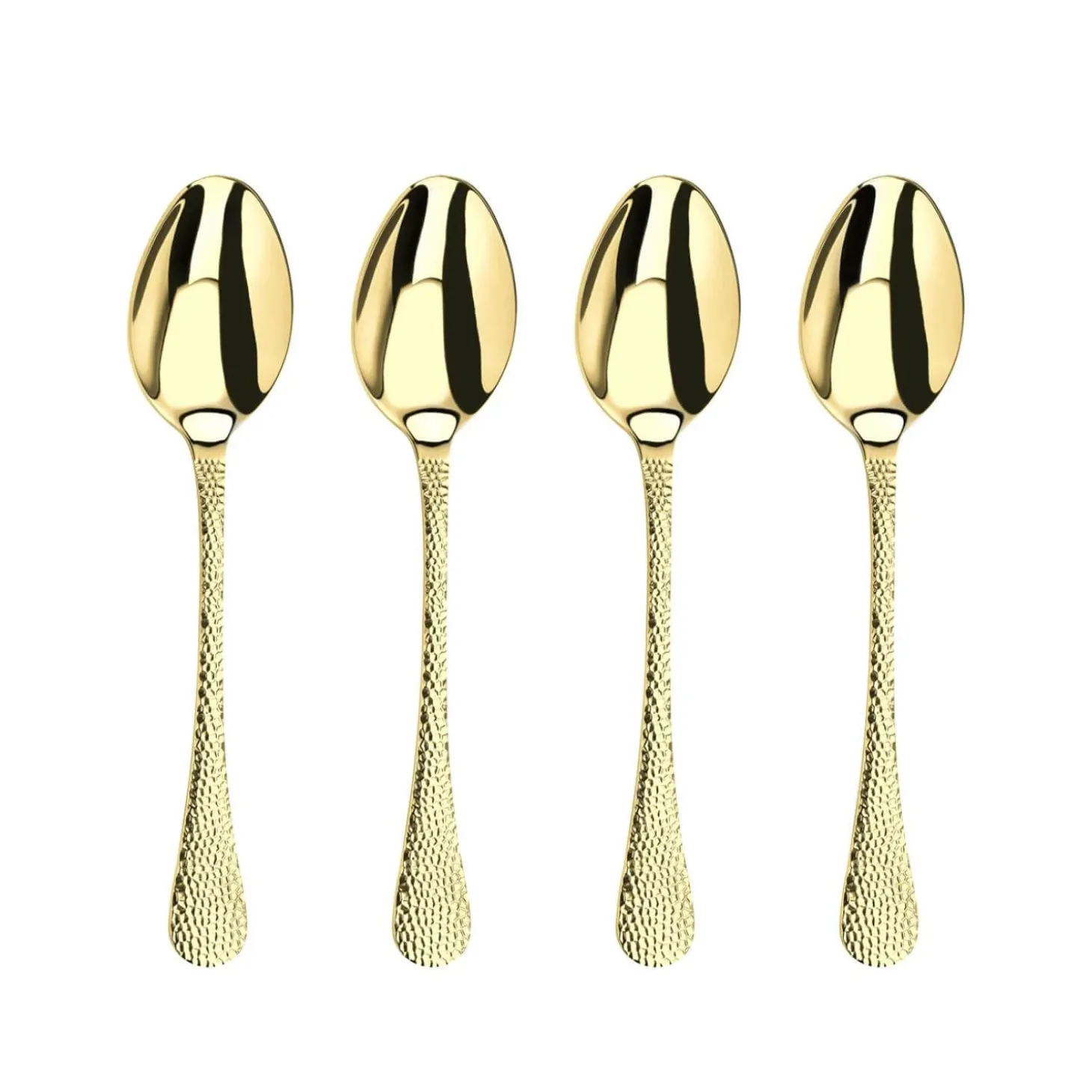 Arthur Price presents the Avalon Set of 4 Serving Spoons in Champagne, beautifully crafted from the finest 18/10 Sovereign Stainless Steel using the very best chromium and nickel in a gold finish. This stylish set, with its hammered handles flaring towards the end, will certainly add a touch of elegance to your dining table.