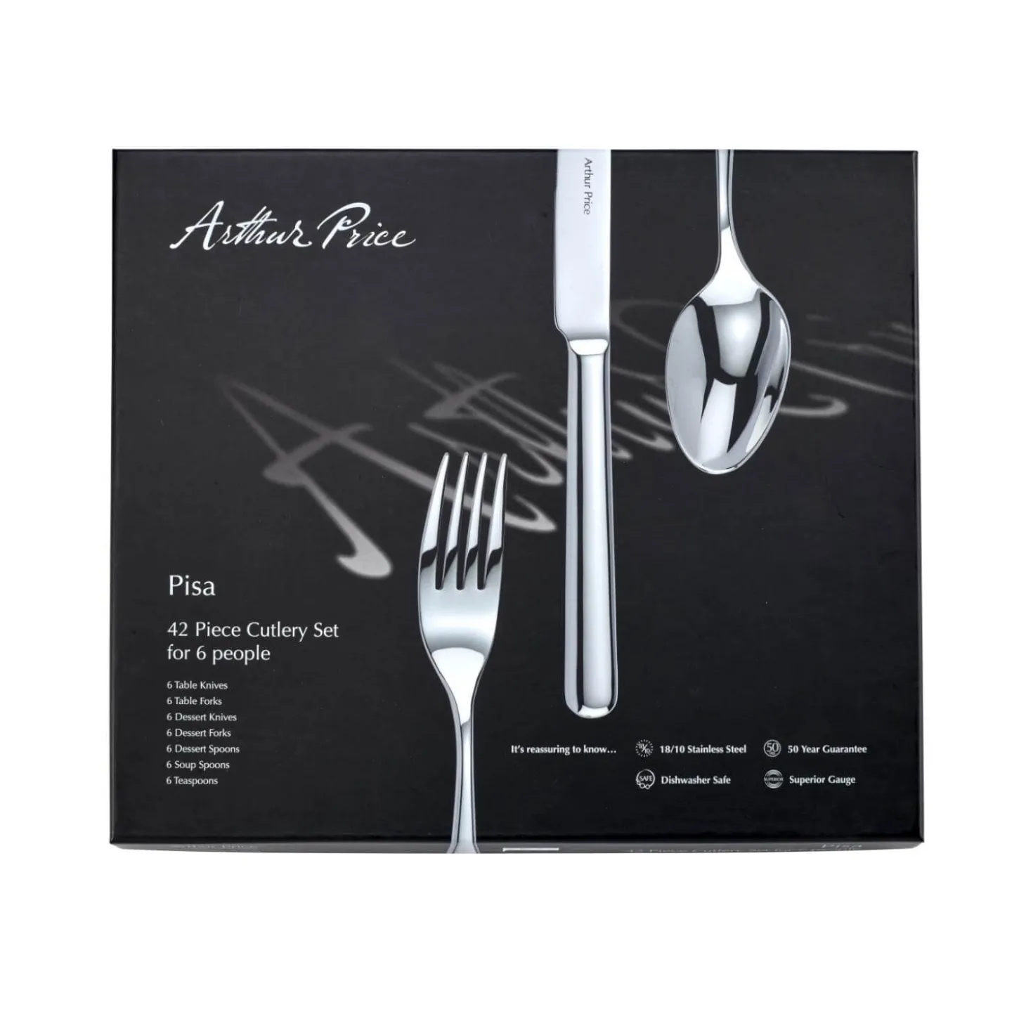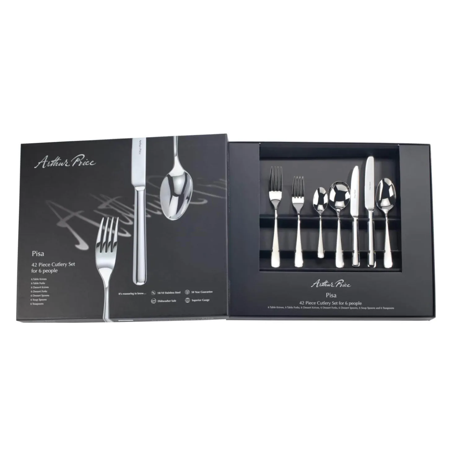 Arthur Price presents the Pisa 42-Piece Cutlery Set, beautifully crafted from the finest 18/10 Sovereign Stainless Steel using the very best chromium and nickel. This stylish cutlery set, with its sleek handles and sculptured bowls, will certainly add a touch of elegance to your dining table.