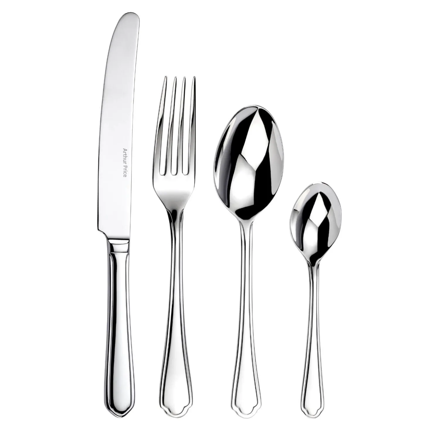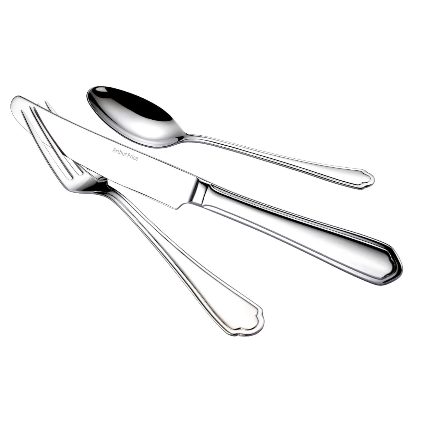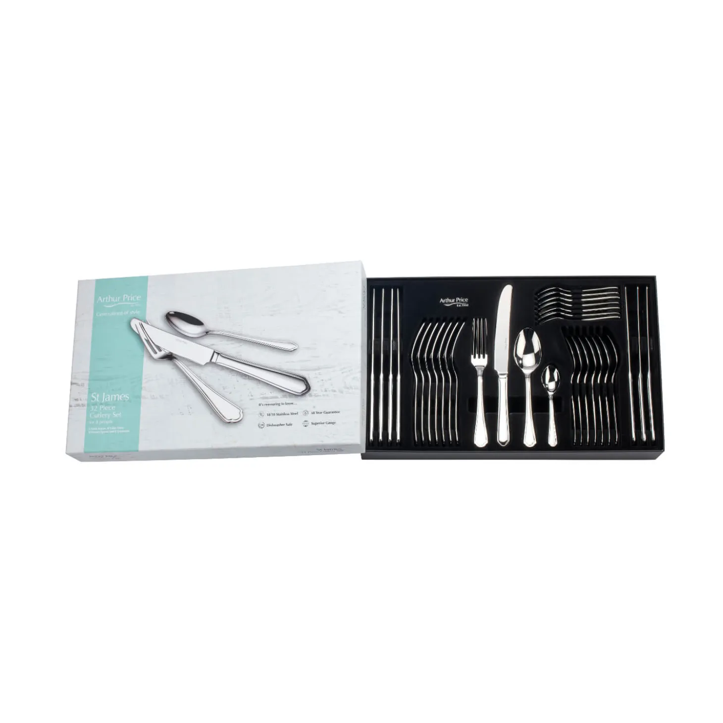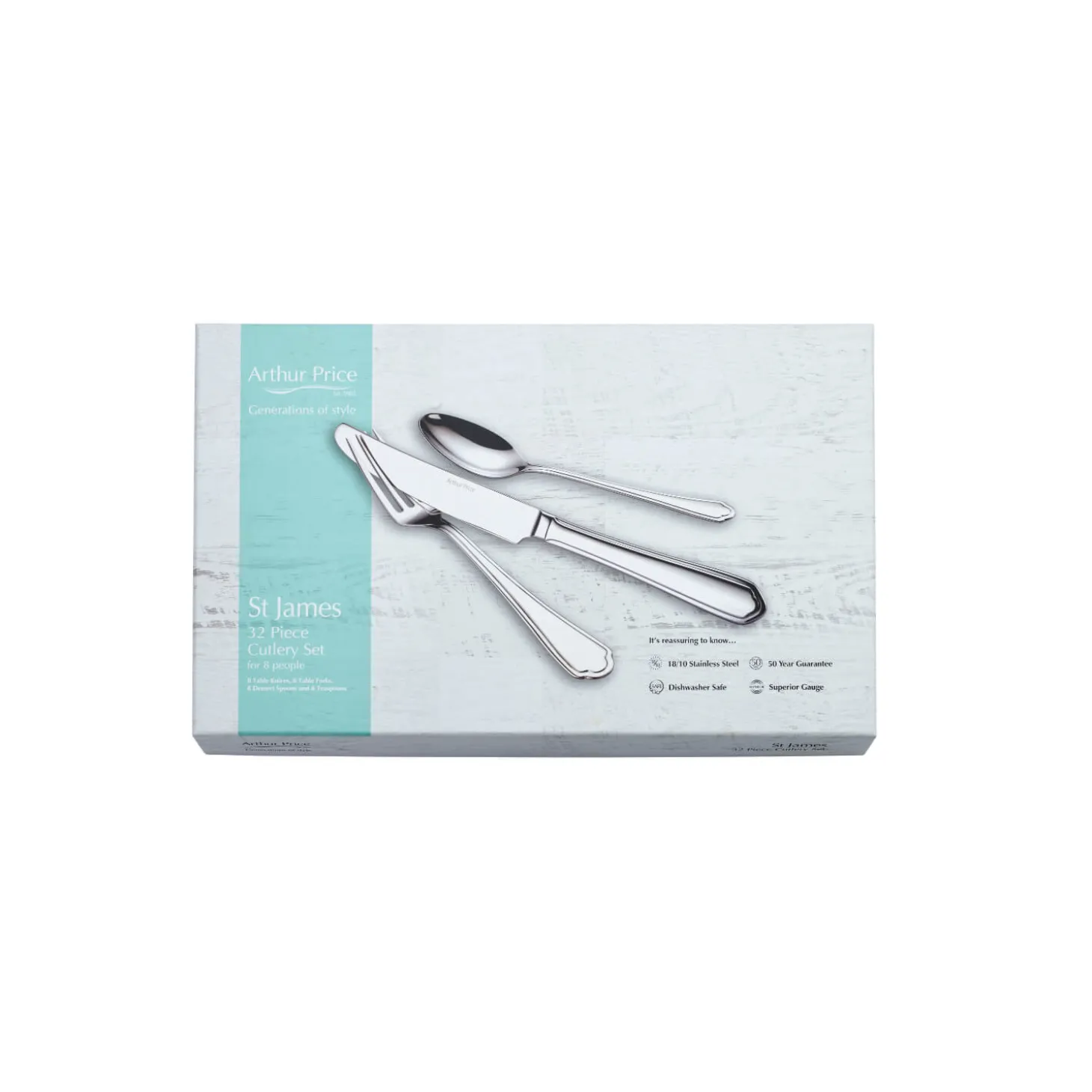 Arthur Price presents their range of cutlery from the St James range. This set of 32 pieces is ideal for dinner parties or large households. Featuring elegant finish touches that have been crafted from premium grade 18/10 stainless steel. Each item of cutlery has beautifully curved edges, a mirror-polished finish and a contemporary style. Includes a 50-year guarantee.