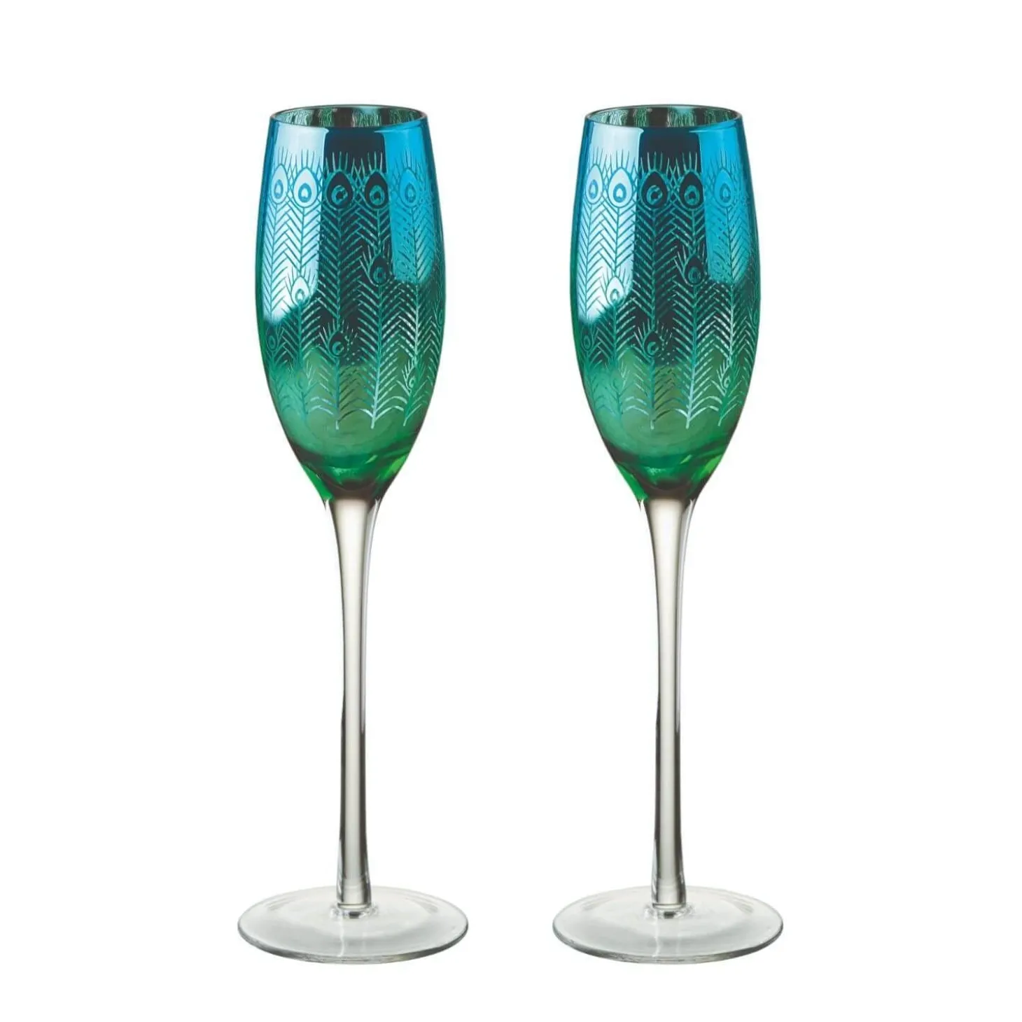 Artland presents their stunning Peacock Champagne Flutes. These beautiful glasses are handcrafted and mouth-blown by skilled craftsmen with an unusual design of plated silver on the inside creating colour changes of turquoise to metallic blue on the outside, a peacock feather design encircles around the bowl of the glass. These glasses will bring style to your table when entertaining or make a wonderful gift to family or friends.