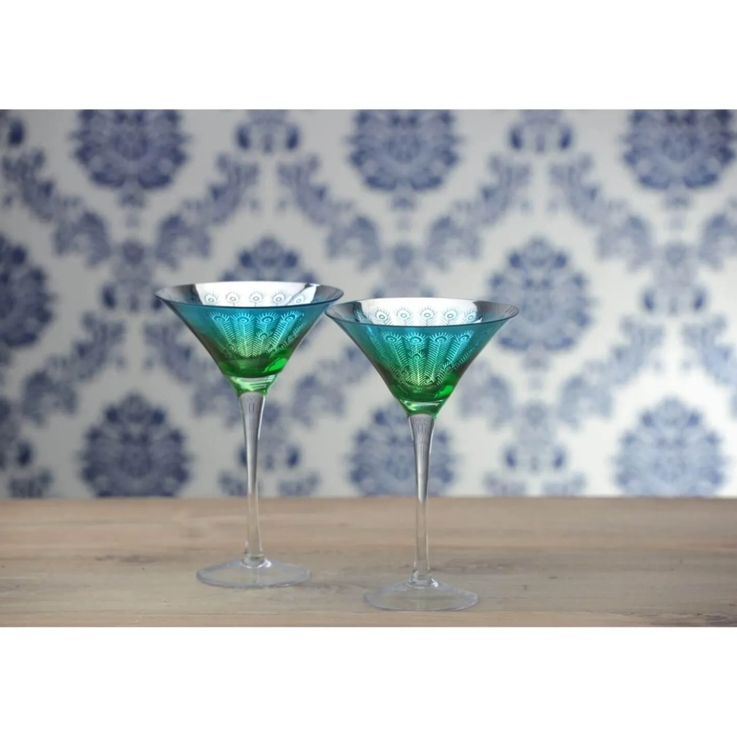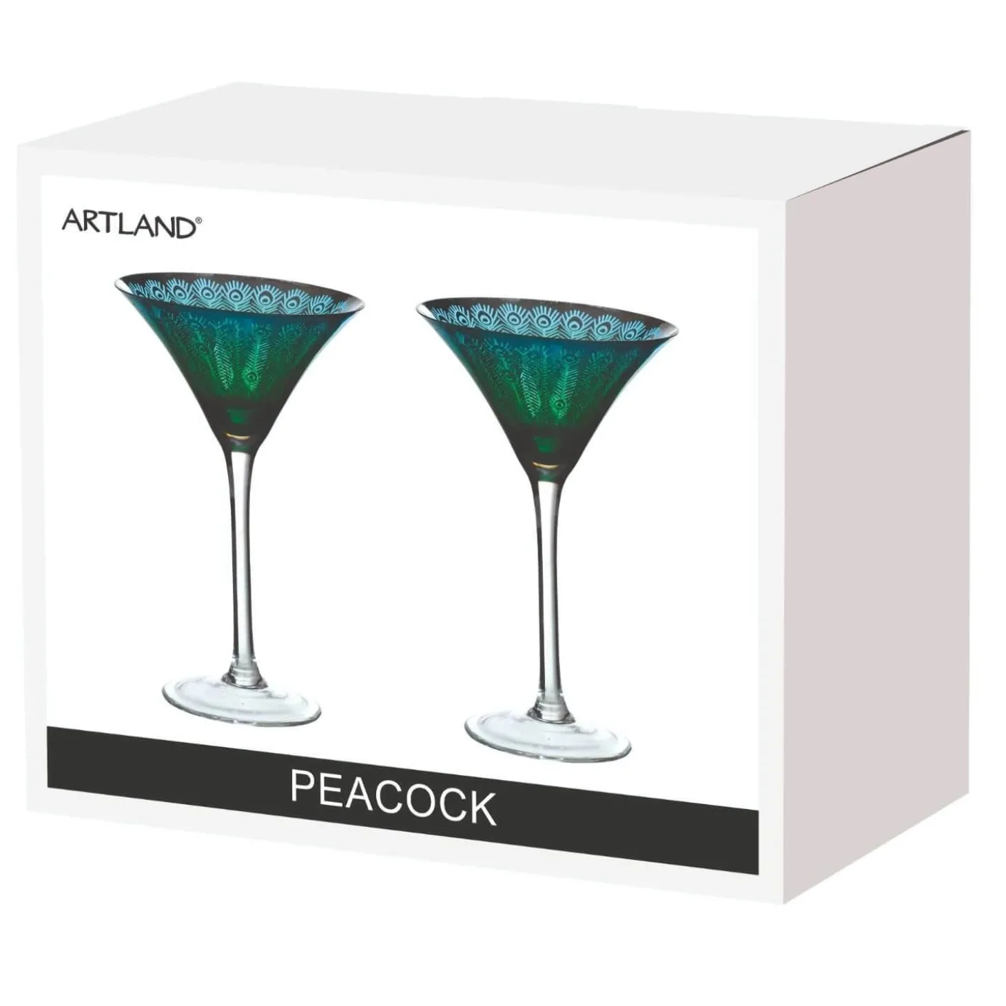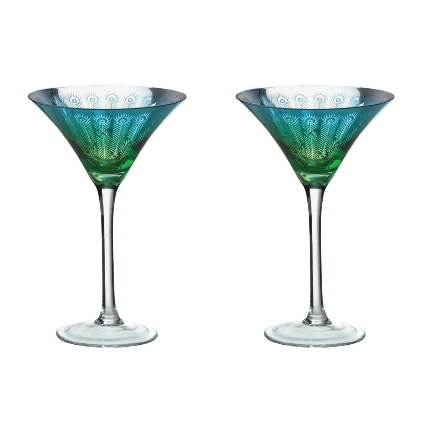 Artland presents their stunning Peacock Martini Glasses. These beautiful glasses are handcrafted and mouth-blown by skilled craftsmen with an unusual design of plated silver on the inside creating colour changes of turquoise to metallic blue on the outside, a peacock feather design encircles around the bowl of the glass. These glasses will bring style to your table when entertaining or make a wonderful gift to family or friends.