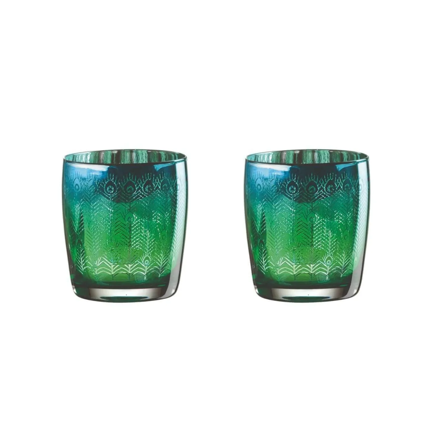 Artland presents their stunning Peacock DOF Tumbler Glasses. These beautiful glasses are handcrafted and mouth-blown by skilled craftsmen with an unusual design of plated silver on the inside creating colour changes of turquoise to metallic blue on the outside, a peacock feather design encircles around the bowl of the glass. These glasses will bring style to your table when entertaining or make a wonderful gift to family or friends.