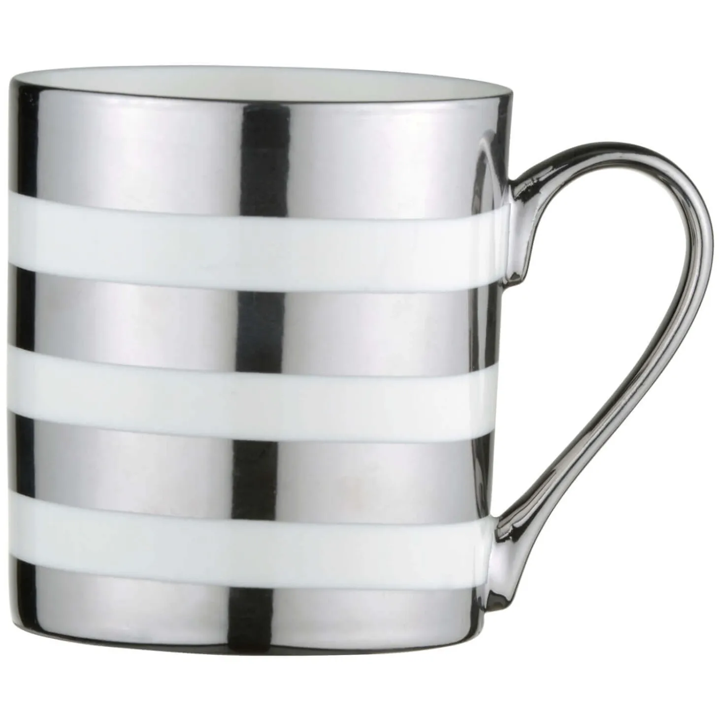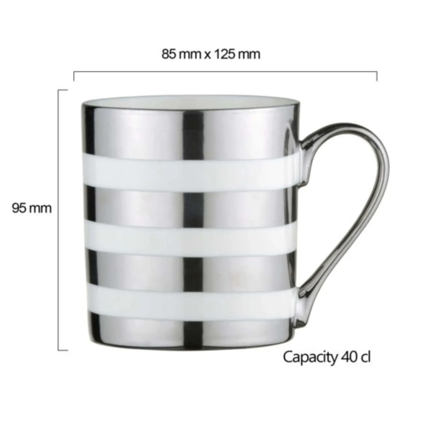 Bia International presents the Stripes Mug in Platinum, beautifully decorated using a platinum electroplated design with a platinum handle and rim. This stunning mug is made from porcelain with a high-quality glaze creating an excellent finish. An elegant mug for your tea or coffee for either yourself or a guest.