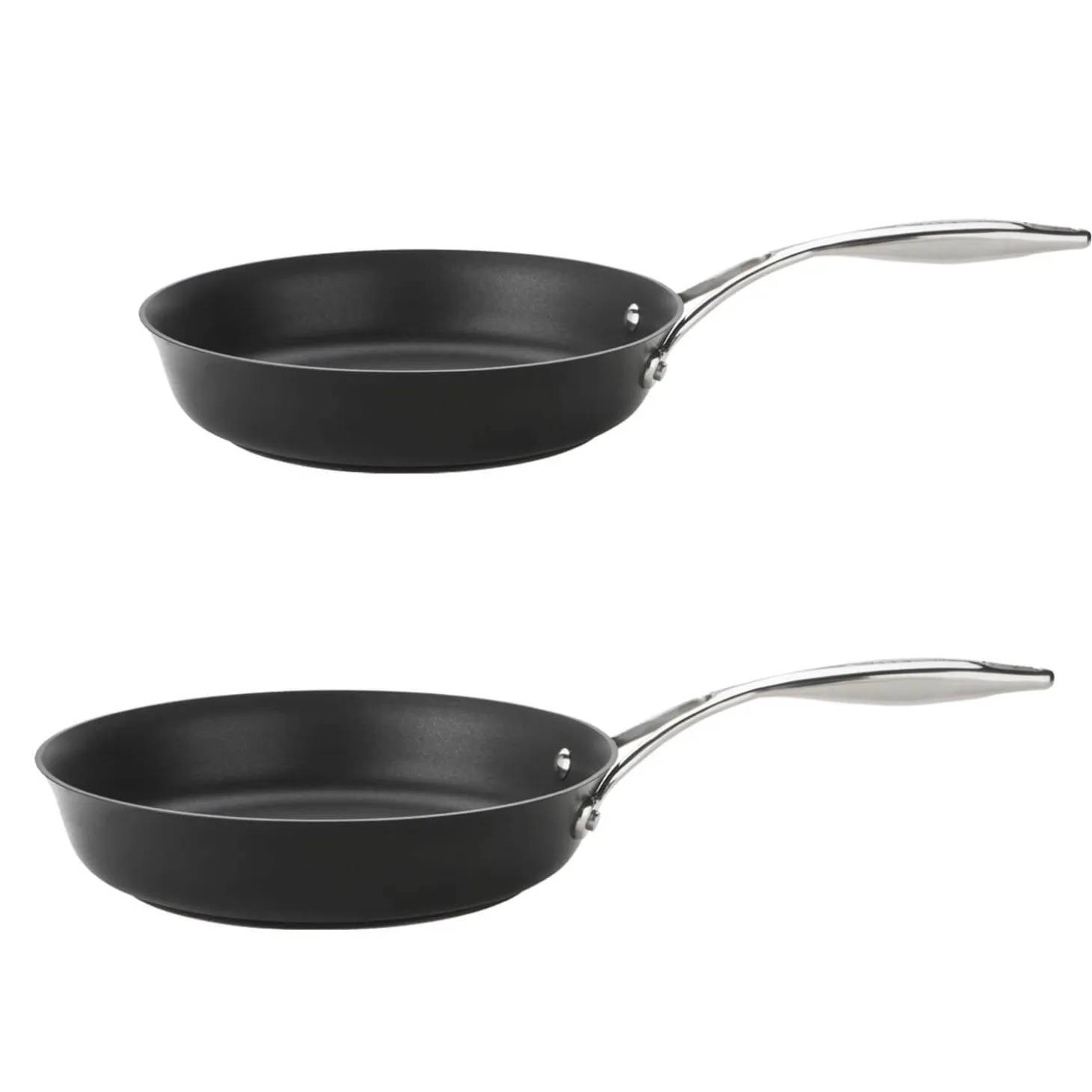 Circulon presents this set of 2 non-stick frying pans in sizesĀ 25cm & 28cm from the Style Hard Anodised series of high-performance cookware. Ideal for frying ingredients to make curries, eggs and other dishes. Created using heavy-duty alloy with an induction suitable base. Each piece of cookware in the collection has an ergonomic riveted handle for maximum comfort and control. On the surface and exterior of the pans, they are coated with an incredibly resilient non-stick coating that lasts up to 15x longer to ensure easy release, cleaning and healthy cooking by limiting the need for oils and fats. Includes a lifetime guarantee.