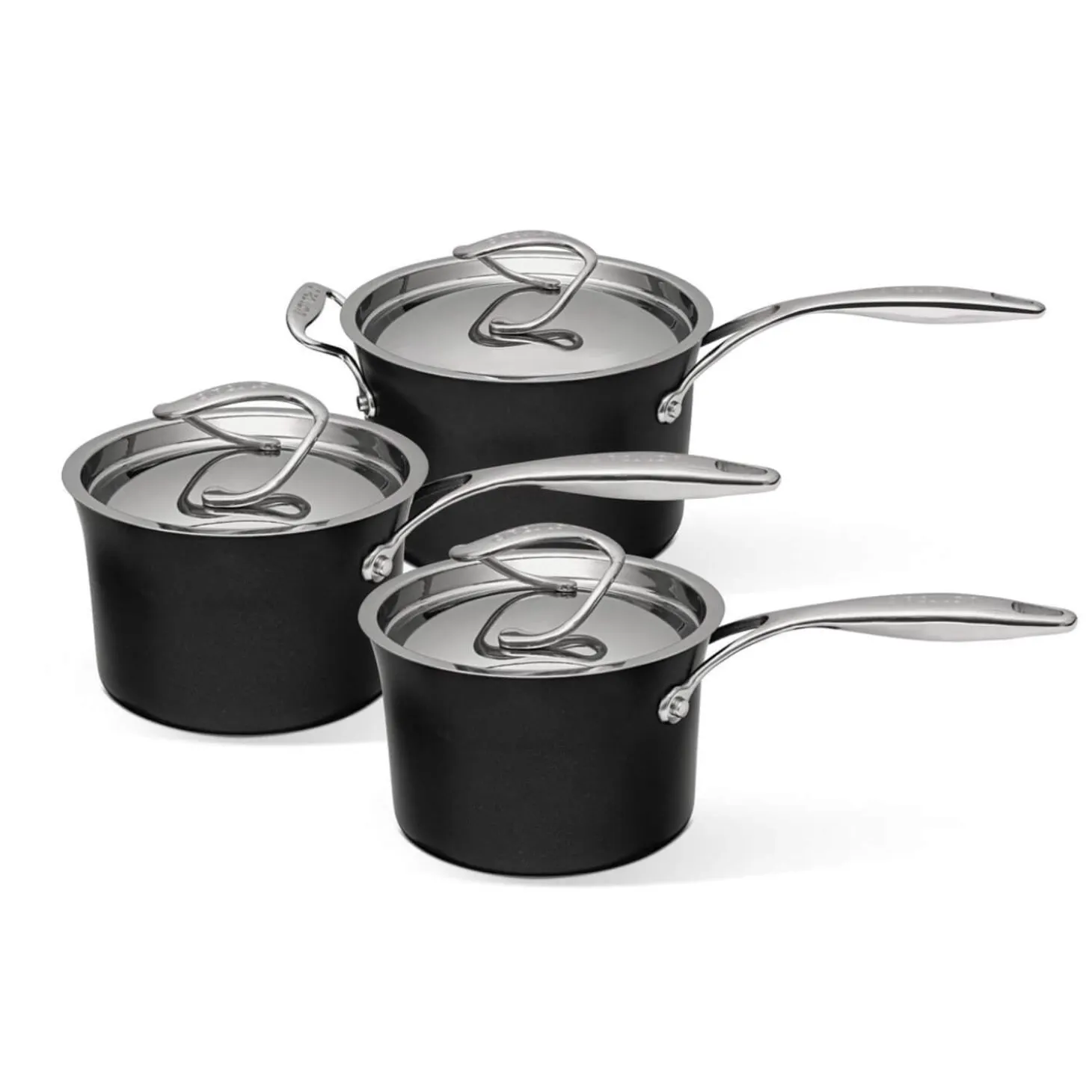 - Includes a 16cm, 18 and 20cm saucepan with lids