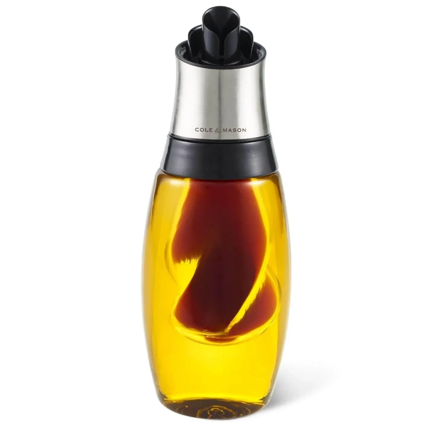 The Cole & Mason Oil & Vinegar range, this pourer has been designed as a practical and elegant solution for oil, vinegar and other pourables storage and dispensing, with a wide nece and removable vinegar well for easy filling. Having two individual spouts and drip return system, means no cross contamination of oil and vinegar plus this systems prevents no oil or vinegar escapes down the side of the exterior. The stainless steel lid easily rotates to which between the two. The capacity for oil is 420ml and 50ml for the vinegar. The Cole & Mason Due Oil & Vinegar Pourer is a stylish and practical piece to compliment any kitchen or dining table.