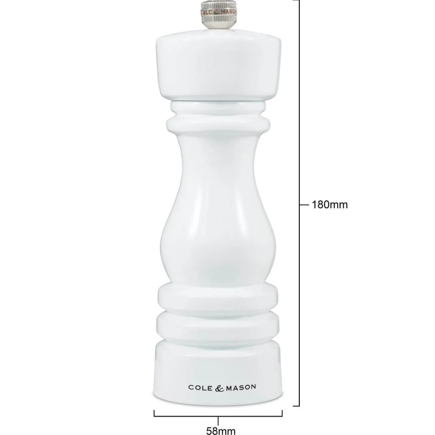 Cole & Mason present the London Beech Wood 18cm Pepper Mill in Gloss White, featuring the precision+ carbon steel mechanism on the pepper mill they are known for, making these mills a hardwearing functional addition to your kitchen. Traditional design that is ideal for kitchen countertops, dining tables and alfresco dining.