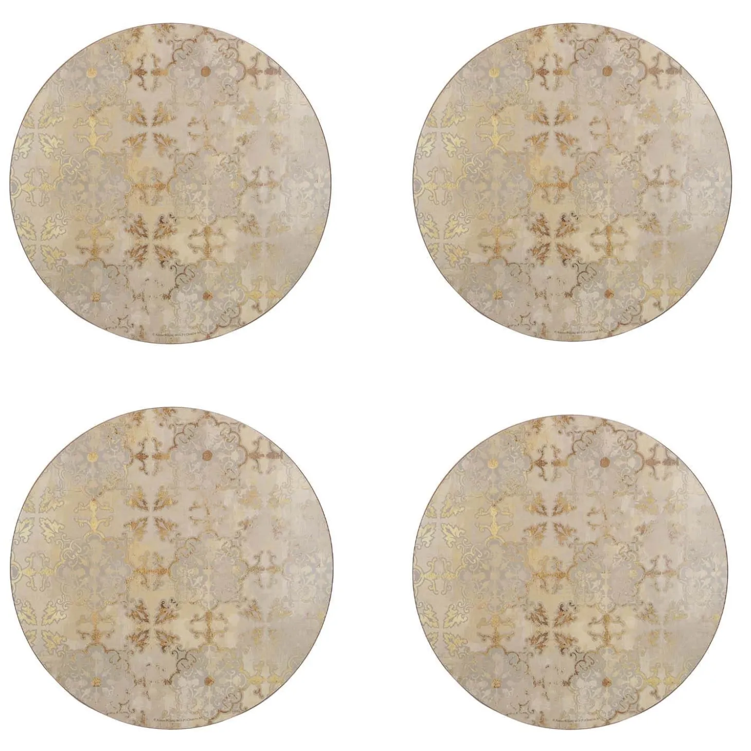 Creative Tops presents the Set of 4 Luxury Round Placemats in Gold Impressions design. Protect your table and tablecloth from messy spills and heat damage with these stunning placemats. Inspired by vintage designs, the delicate filigree floral patterns shimmer on a luxurious gold background, adding an elegant and timeless touch to your table setting.