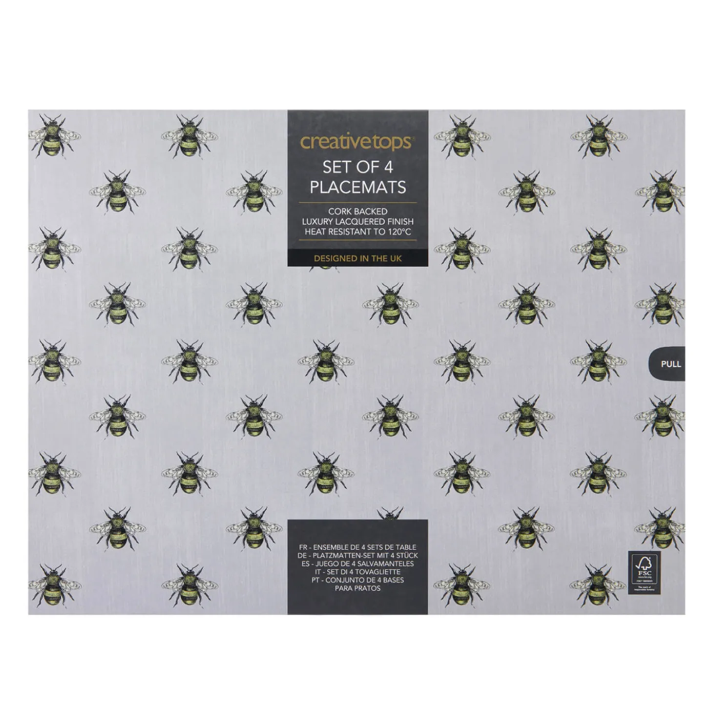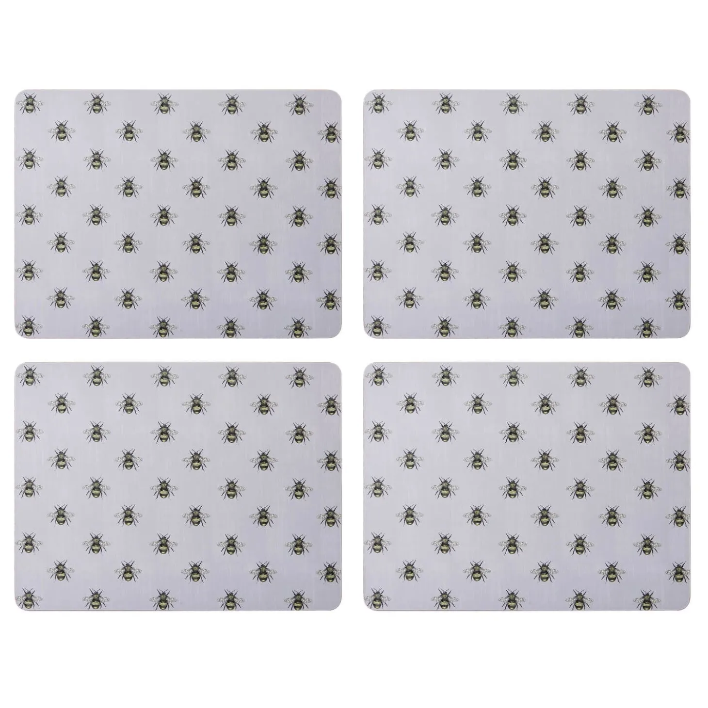 Creative Tops presents the Set of 4 Placemats, featuring a charming bee design. Protect your table from spills and heat damage with these beautifully crafted, cork-backed placemats. The delicate bee pattern on a soft grey background brings a touch of elegance to any table. Stylish and durable, they’re perfect for everyday dining or special occasions.
