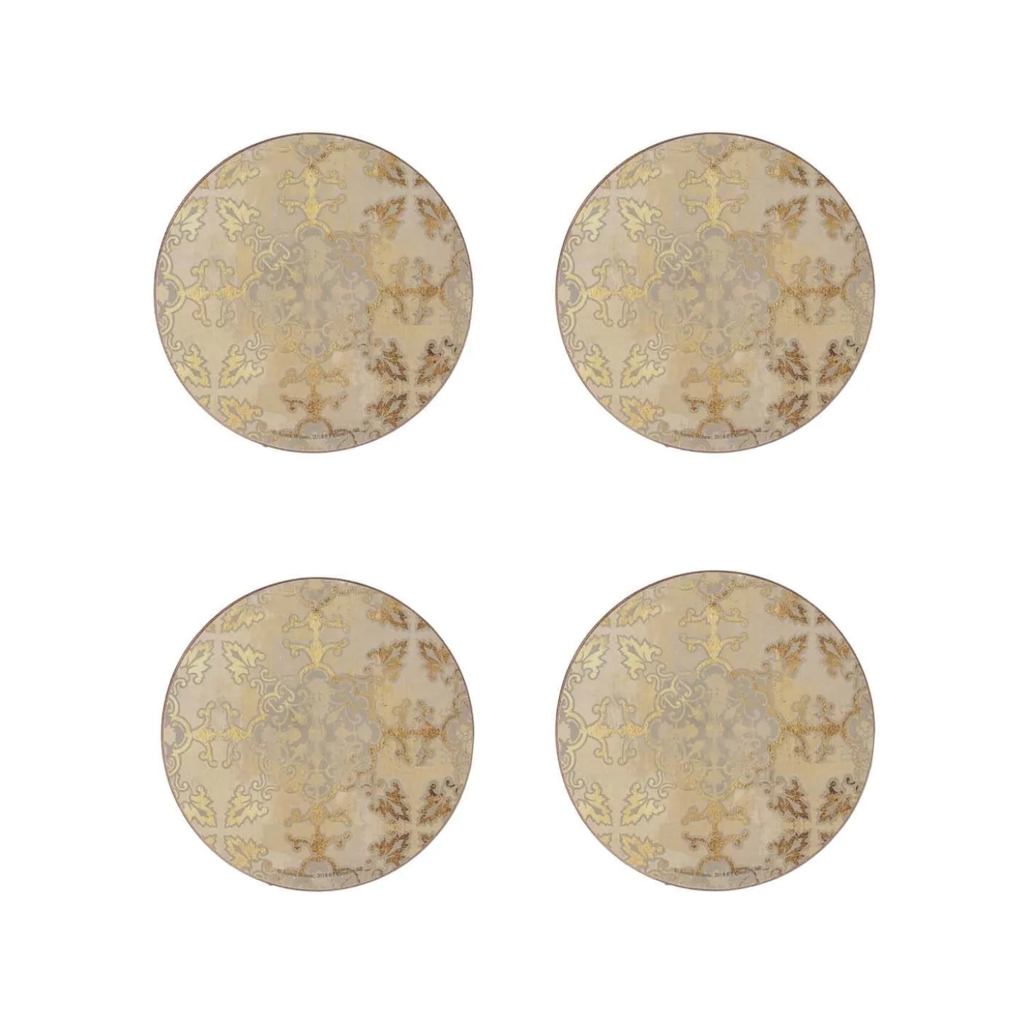 Creative Tops presents the Set of 4 Round Coasters in Gold Impressions design. Protect your furniture from messy spills and heat damage with these stunning coasters. Inspired by vintage designs, the delicate filigree floral patterns shimmer on a luxurious gold background, adding an elegant and timeless touch to your home and table setting.