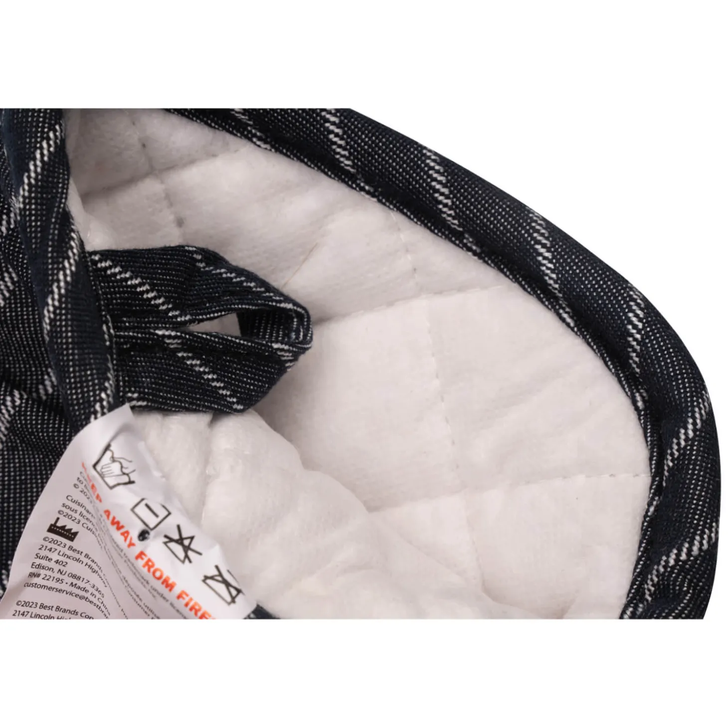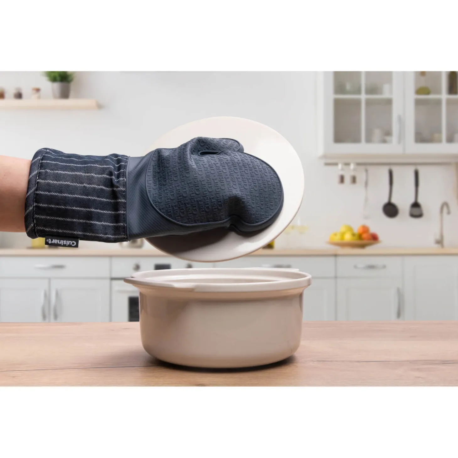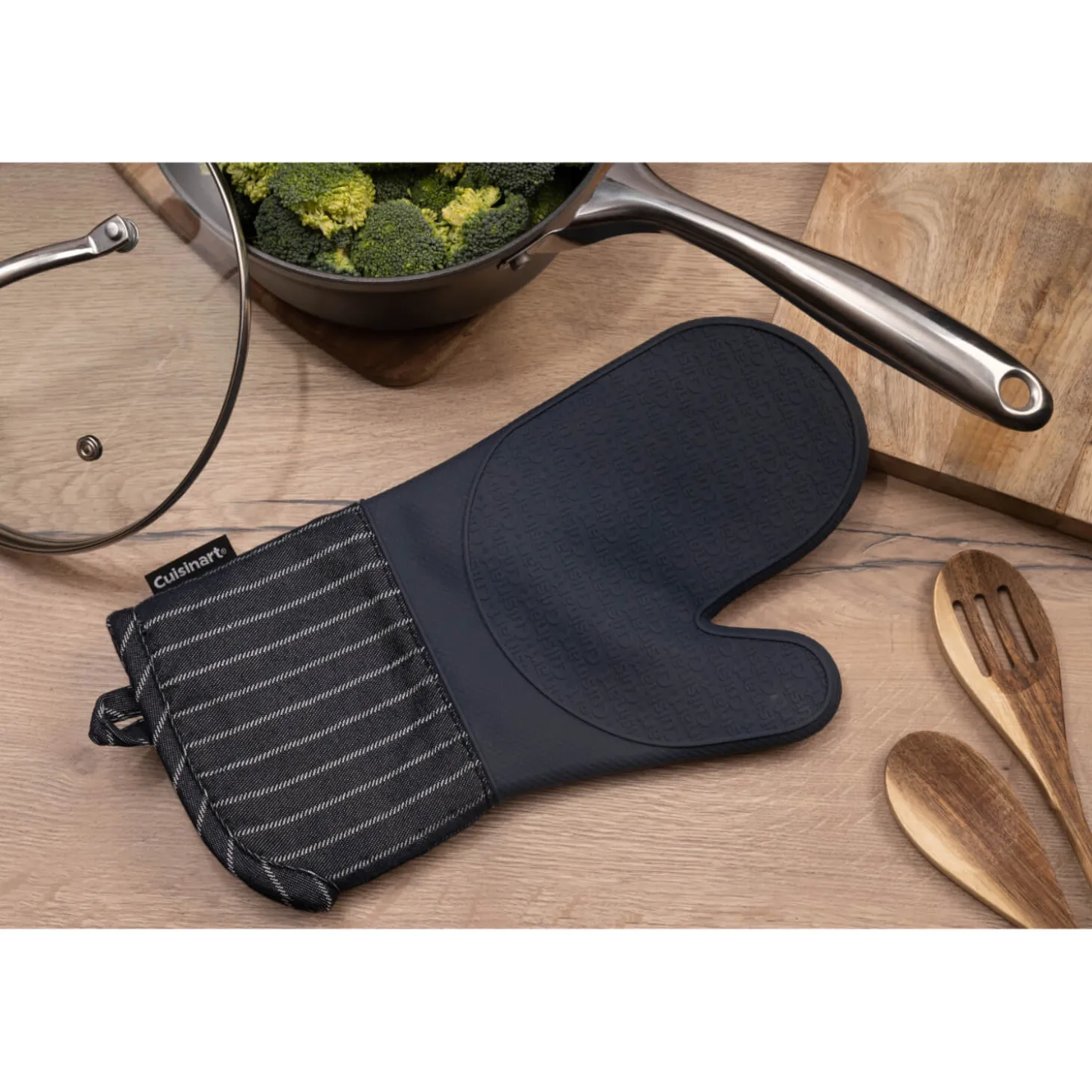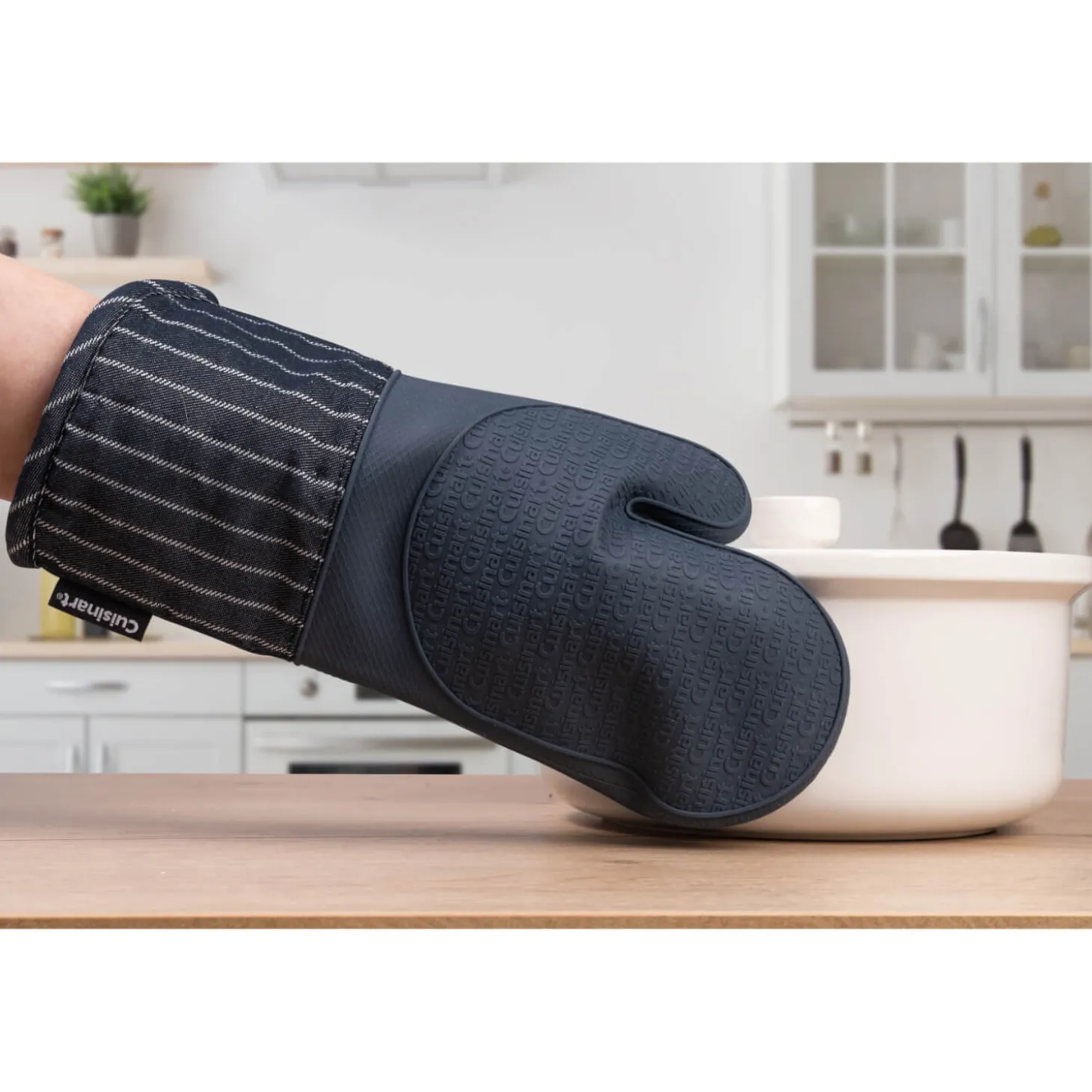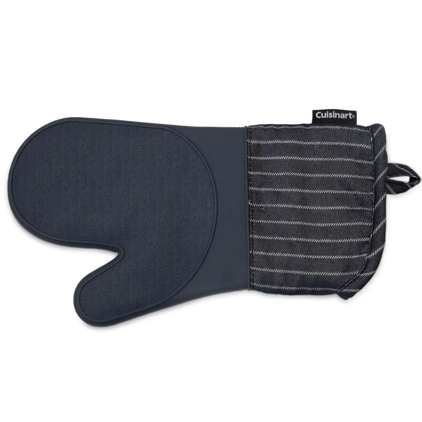 Cuisinart presents the Oven Mitt in Denim Pinstripe, the perfect addition for all cooks kitchens. Made from a cotton polyester blend around the wrist and lower arm area and silicone on the back and front of the hand section, allowing you to lift hot pans and trays from the oven or hob safely. This oven mitt is ideal for all busy kitchens.