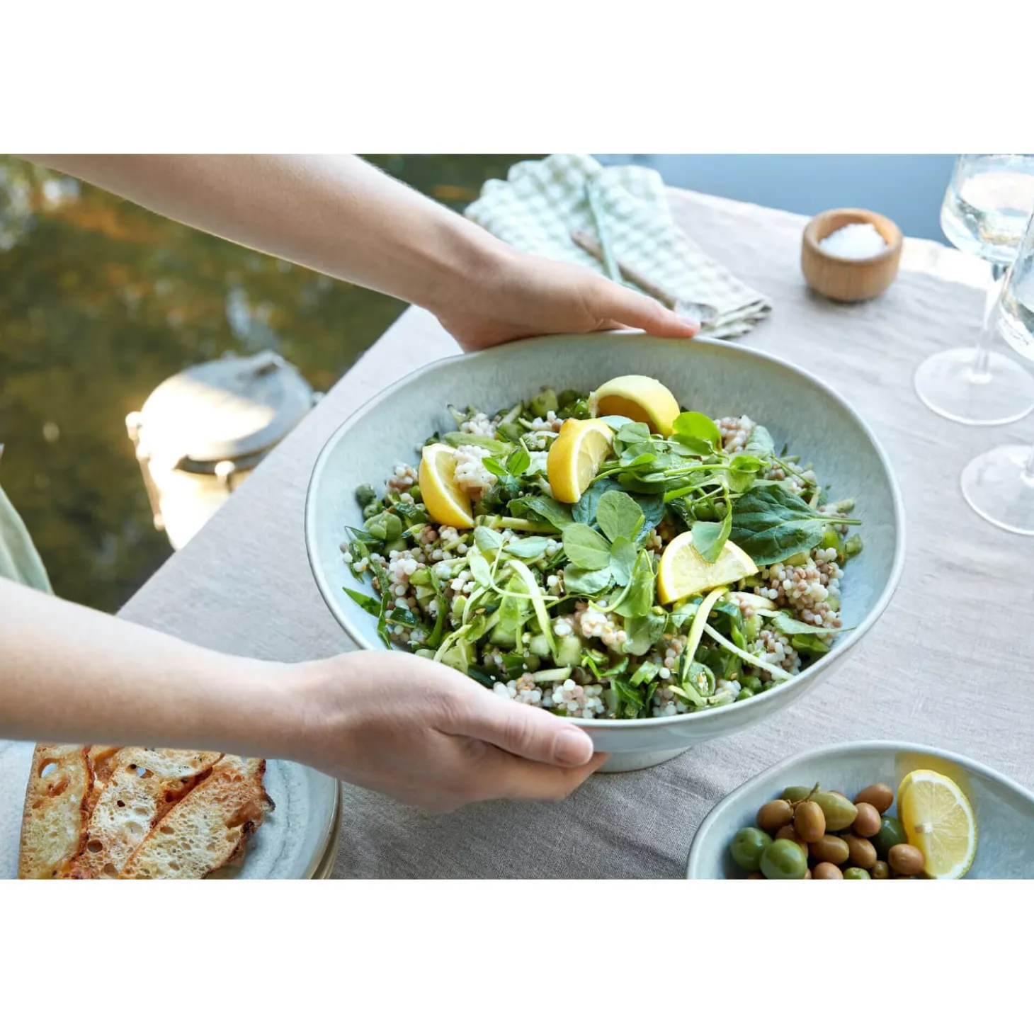 Denby presents their Large Organic Dish in Green. Made from strong and durable Derbyshire clay in Denbys own factory where they have been based for over 200 years, this beautiful bowl has been lovingly made by over 20 pairs of hands by highly skilled artisans. The gorgeous tranquil green colour with its gentle white and celedon shades showcase the stunning reactive glaze effects used across this collection. Its organic shape has been naturally designed to mimic the wonders of nature and perfectly compliment other pieces in the Denby Kiln range enabling you to add to your pottery collection. This eye-catching bowl would make a marvellous gift or a treat for yourself. Its versatile size and shape make it ideal for serving a variety of dishes and with the added bonus of it being oven-proof, your delicious creations can be served piping hot from the oven straight to the table!