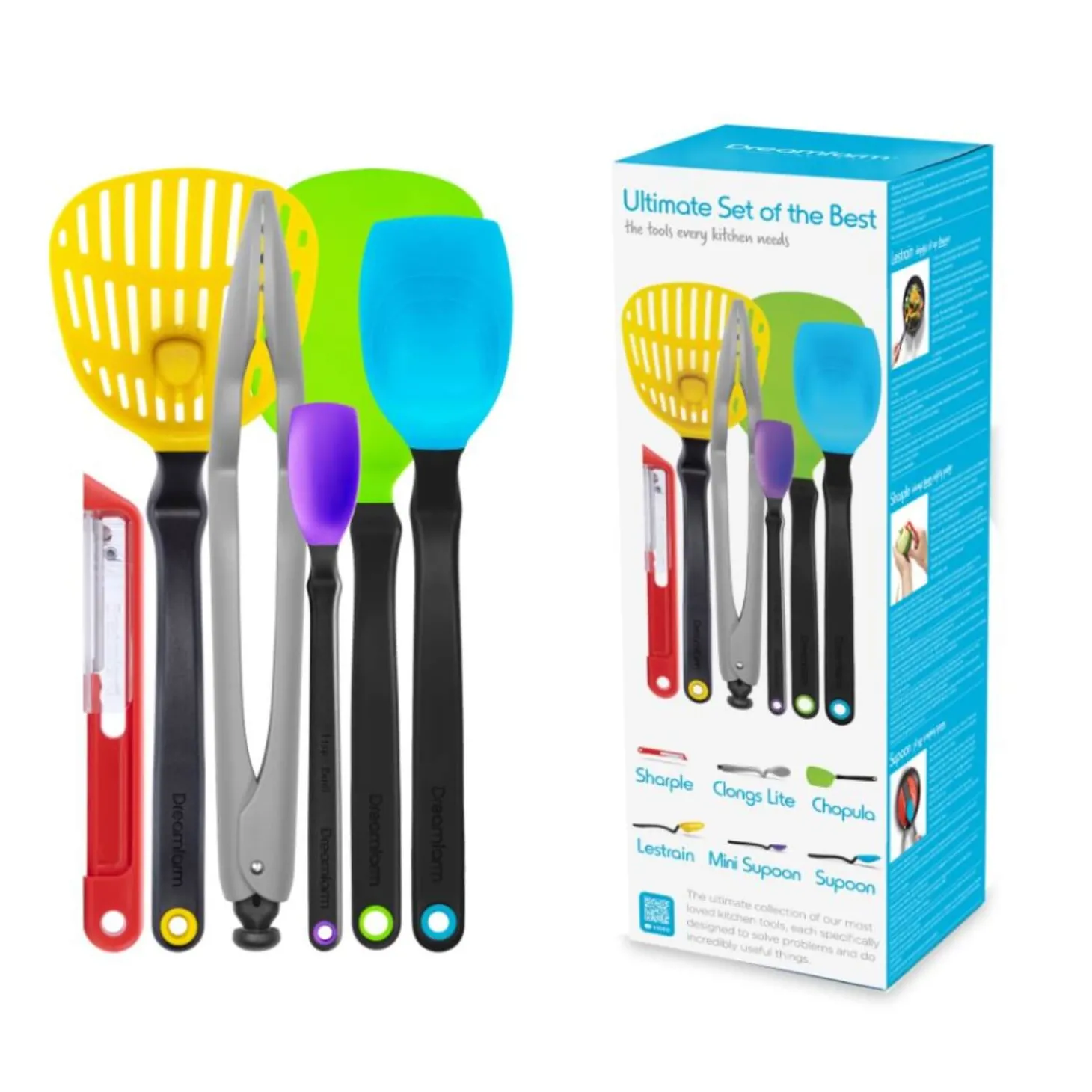 Design award winners Dreamfarm present their Set Of The Best utensil set. Comprised of the Sharple a self-sharpening swivel peeler, Mini Supoon a silicone jar spoon, Supoon a silicone scraping spoon, Clongs Lite click-lock serving tongs, Lestrain a no-drip scoop strainer and Chopula a flexible chopping spatula. An all-round super utensil set for all cooks kitchens!