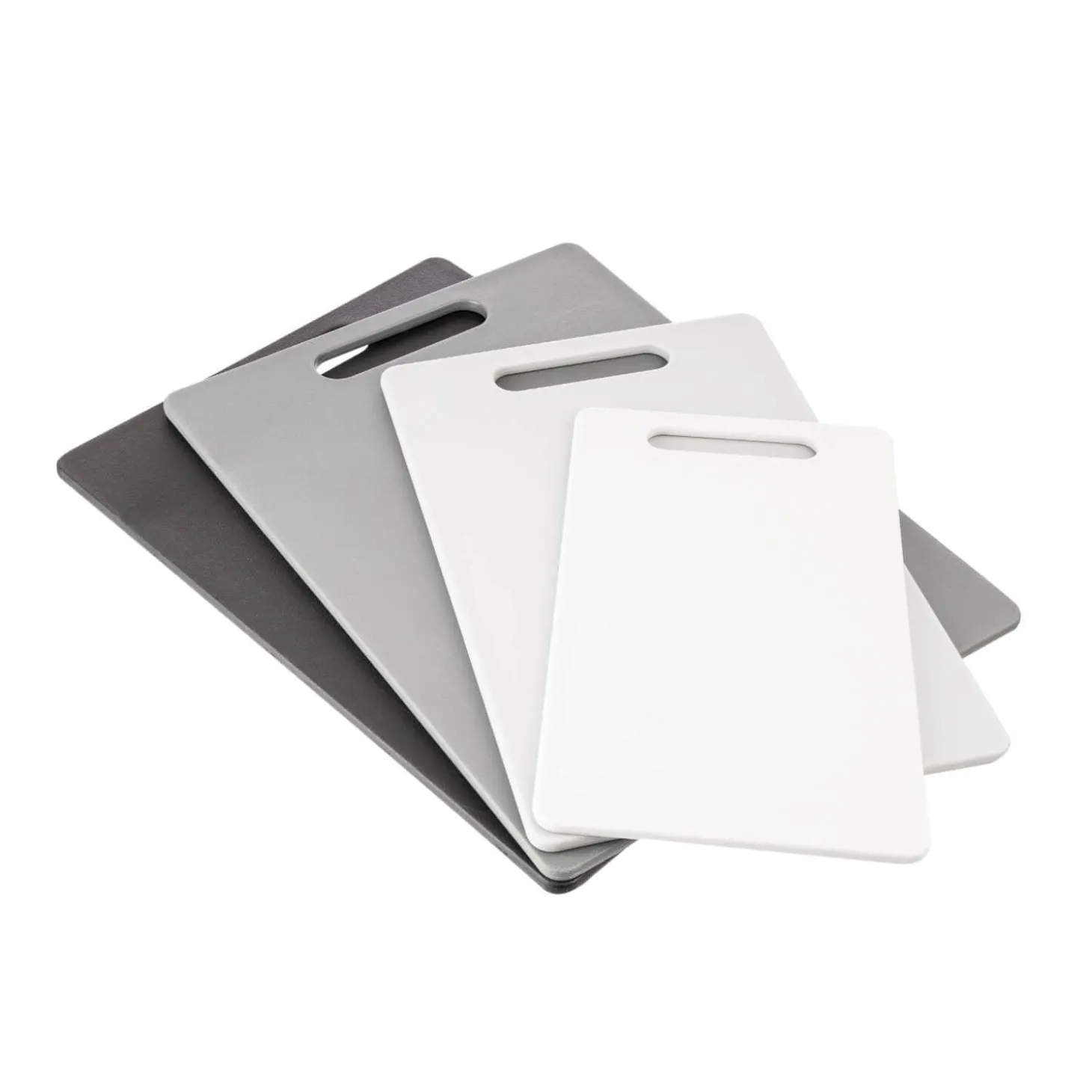 Fusion presents this 4 piece set of colour-coded chopping boards. With 3 different sizes in tonal greys for easy identification to prevent cross-contamination which makes this set a cooks kitchen staple! Each board has a blade friendly surface which is easy to clean and will not damage the blades of your favourite knives. A slimline design ensures easy and safe storage whilst integrated handles enable you to move chopped ingredients from the counter to the pan.