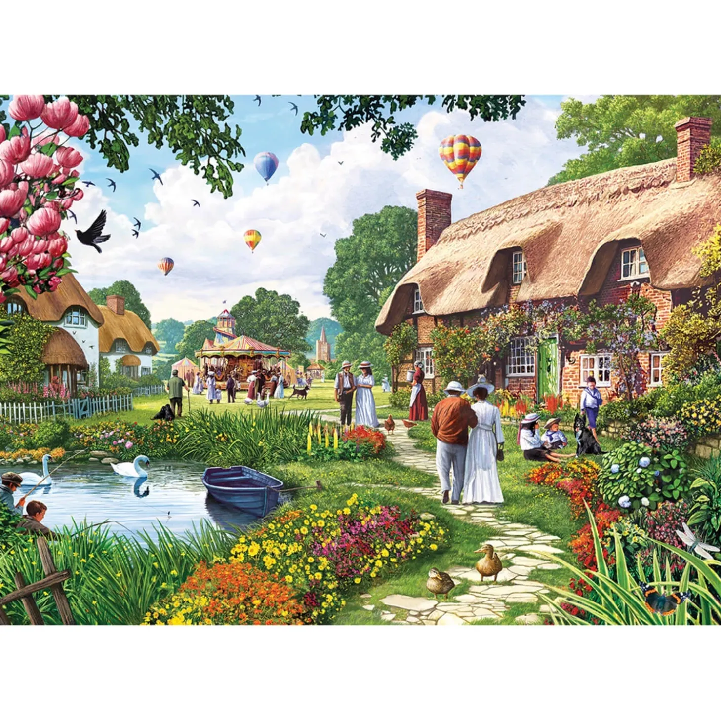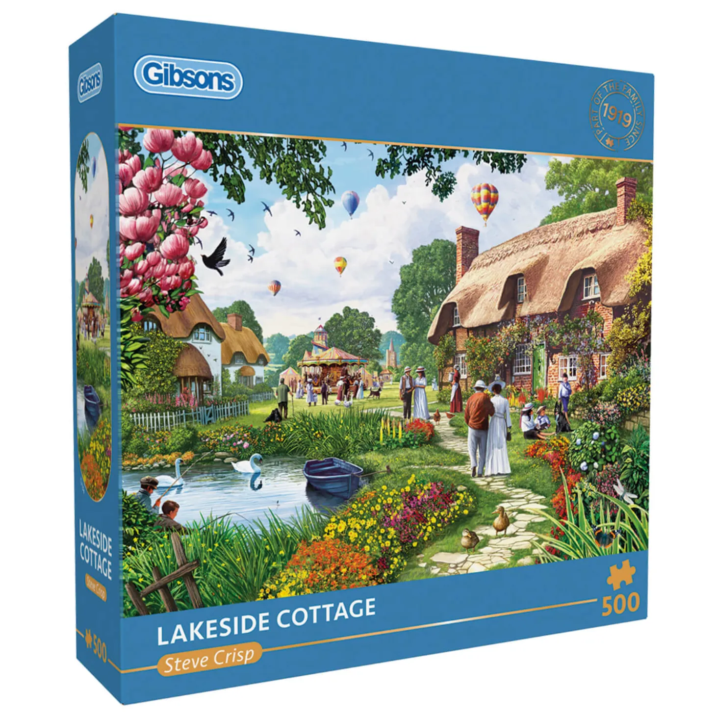 Gibsons presents the ‘Lakeside Cottage’ 500-piece jigsaw puzzle, showcasing a vibrant village scene with charming thatched cottages, colourful gardens, and hot air balloons drifting in the sky. A perfect celebration of peaceful countryside life. All Gibsons jigsaws are created using sustainably sourced paper and a 100% recycled puzzle board, the pieces are thick and strong and designed to fit together perfectly. This puzzle would make a wonderful gift or a treat for yourself.