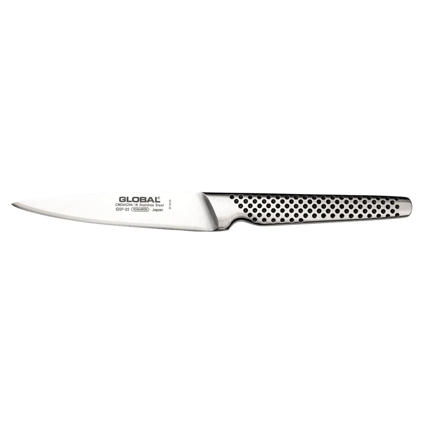 Global’s GSF-Series GSF-22 11cm Utility Knife provides excellent cutting performance and longevity through high-quality manufacturing processes and design. Part of the award-winning Classic range, the blade of the knife has been created using CROMOVA18 stainless steel that is sharpened to a 15-degree angle proving unmatched performance. Designed by Komin Yamada.