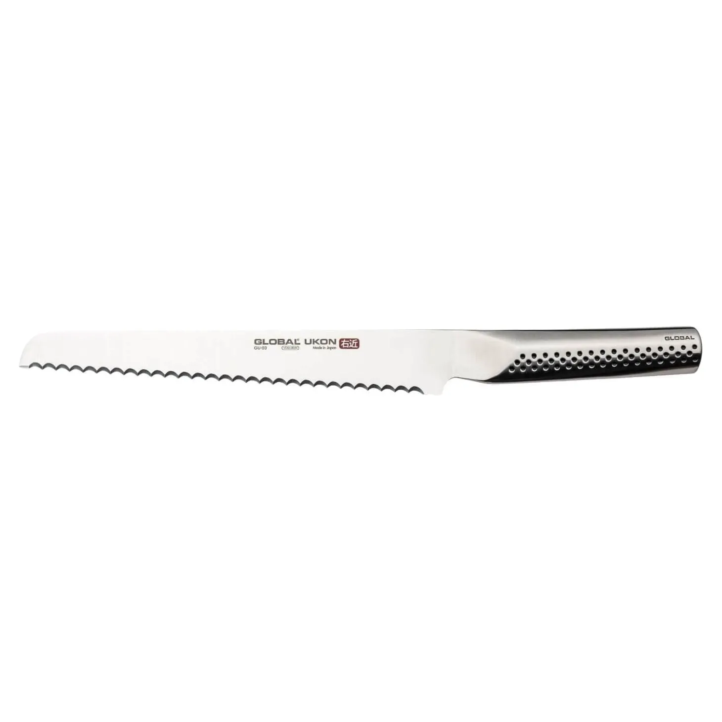Global presents this 22cm GU-03 Bread Knife as part of their UKON Knife collection. Created using Cromova 18 stainless steel with a thicker blade for added strength, each blade has an acute 15-degree cutting edge that is 10% sharper, there is also an ambidextrous thumb rest for added comfort.