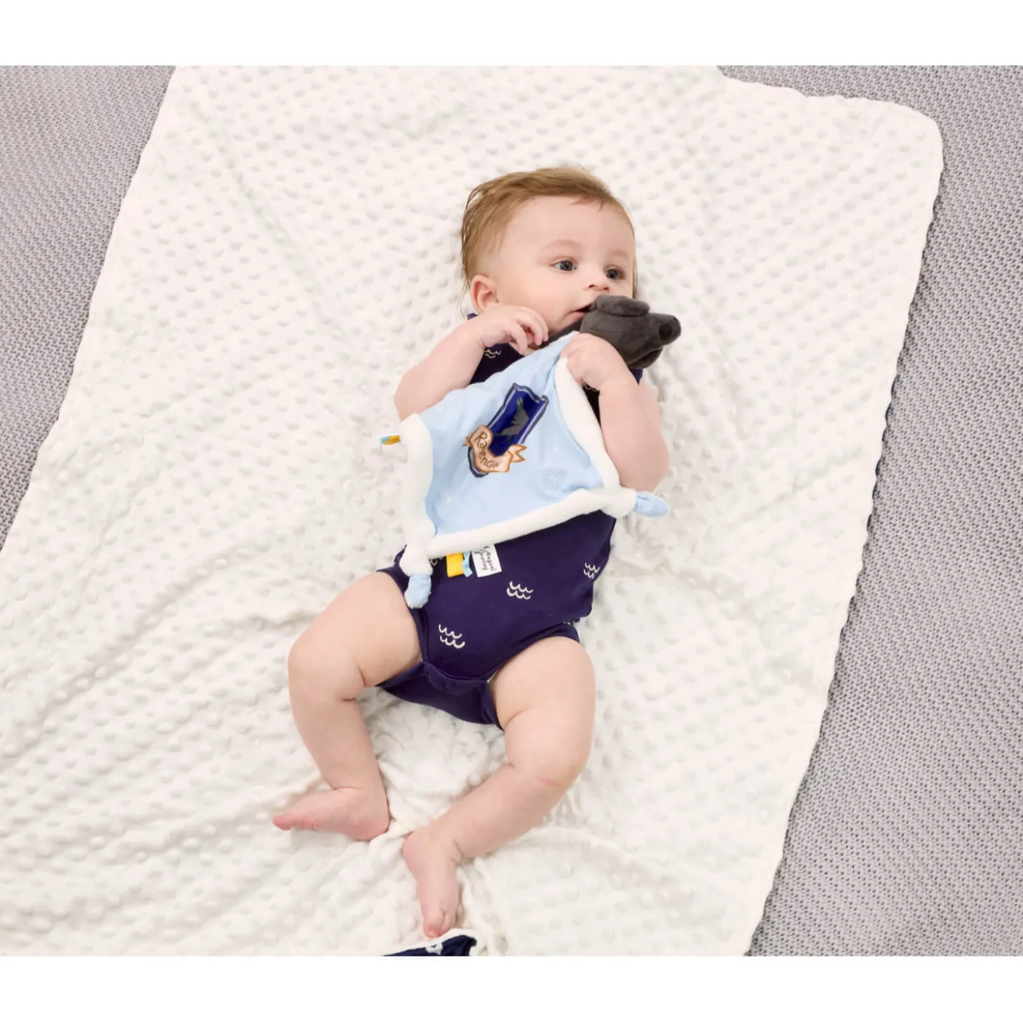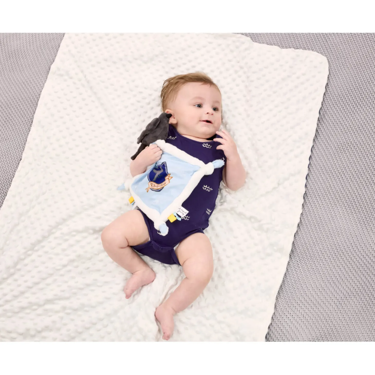 Presenting the Ravenclaw Comfort Blanket, ideal for bringing a touch of magic to your little one’s naps and cuddles. Inspired by the world of Harry Potter, this soft plush blanket features a squishy raven, the Ravenclaw crest and charming embroidered stars. Wonderfully suited for newborns, it also includes soft tags and knotted corners for tiny hands to explore, perfect for little witches and wizards!