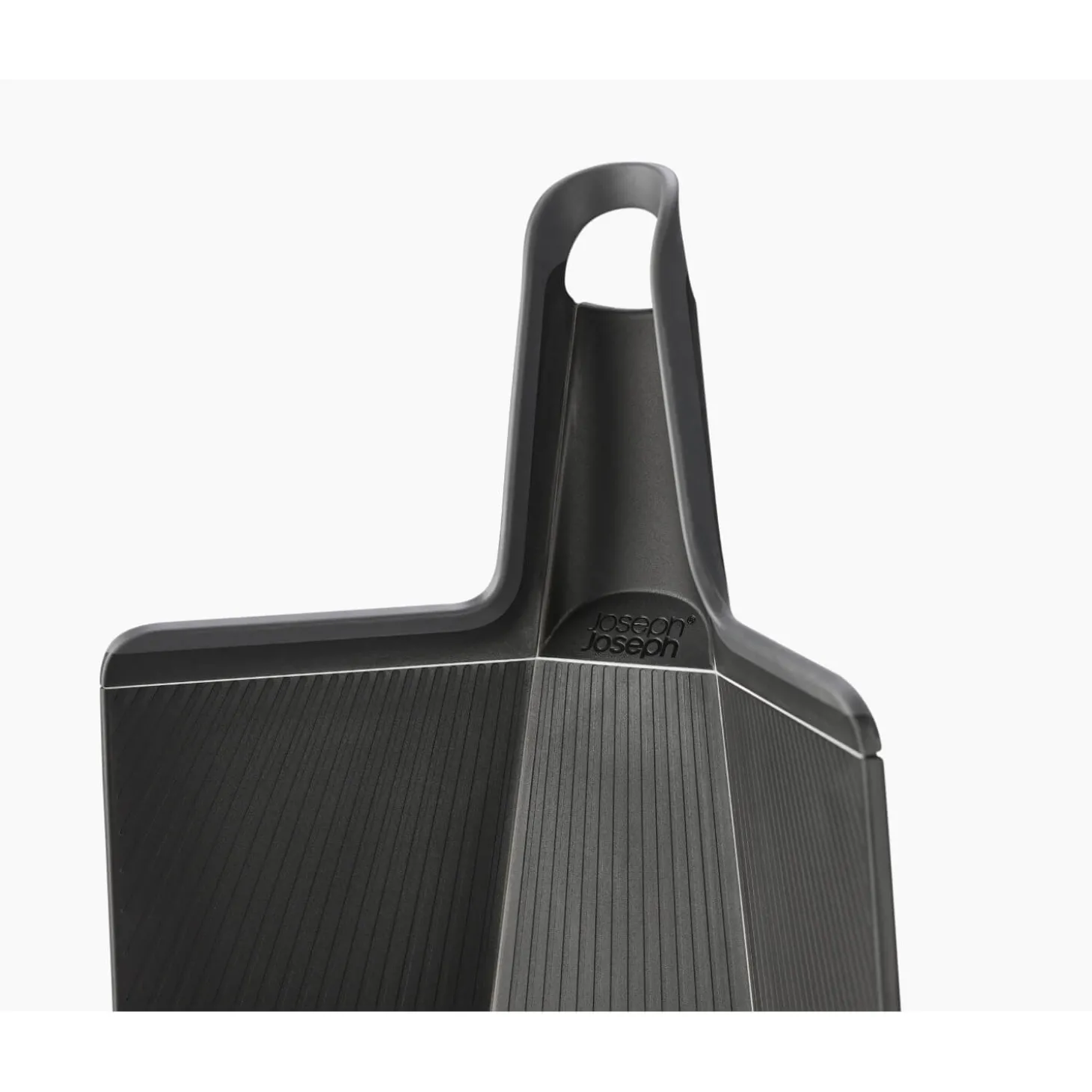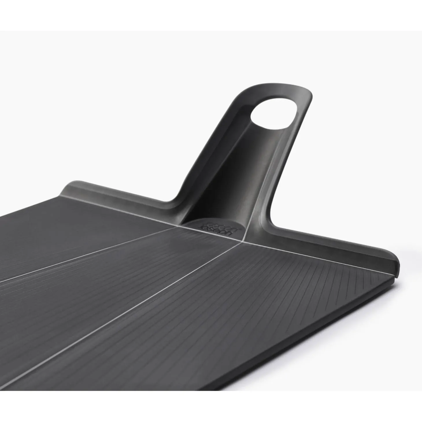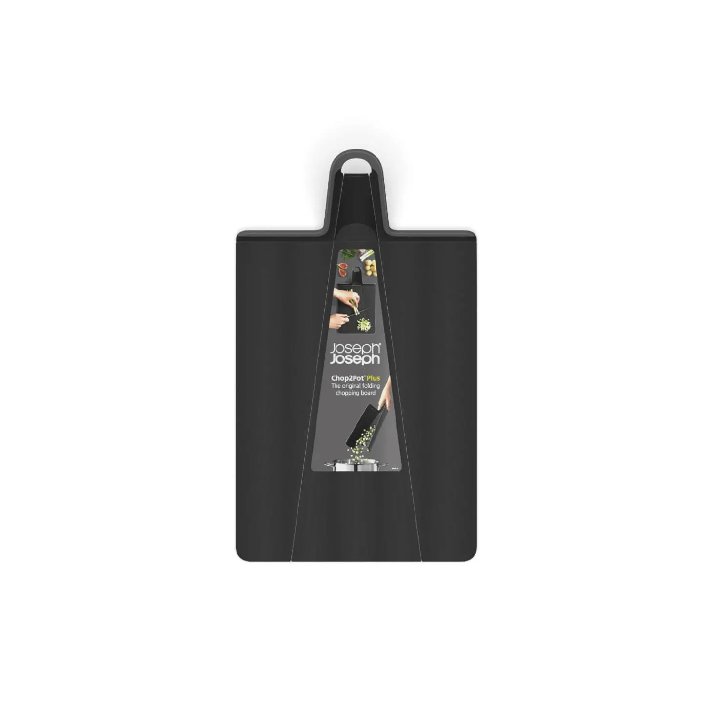 Joseph Joseph presents the Chop2Pot Plus Large Chopping Board in Black, this clever board allows you to easily prepare meat, fruit and vegetables and scoop them directly into your pots and pans, simply squeeze the soft-grip handle on the cutting board which will then create a chute for you to dispense your chopped produce easily. A great cutting board for all cooks kitchens.