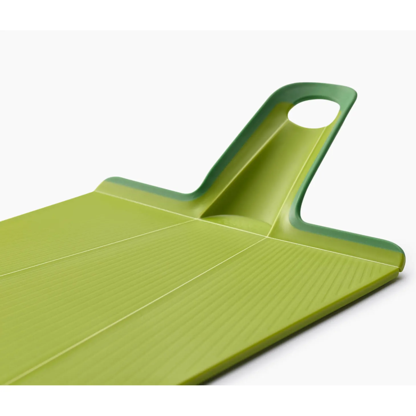 Joseph Joseph presents the Chop2Pot Plus Regular Chopping Board in Green, this clever board allows you to easily prepare meat, fruit and vegetables and scoop them directly into your pots and pans, simply squeeze the soft-grip handle on the cutting board which will then create a chute for you to dispense your chopped produce easily. A great cutting board for all cooks kitchens.
