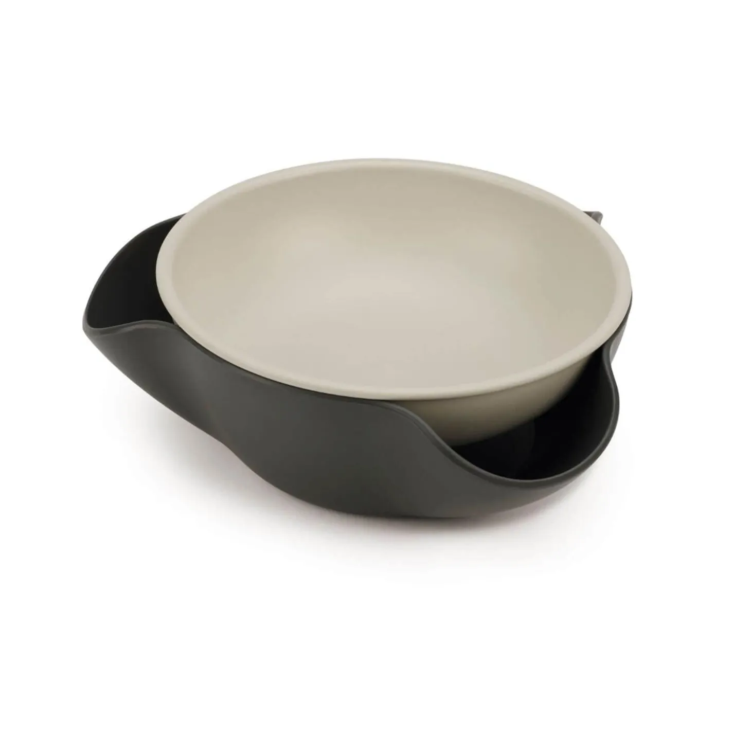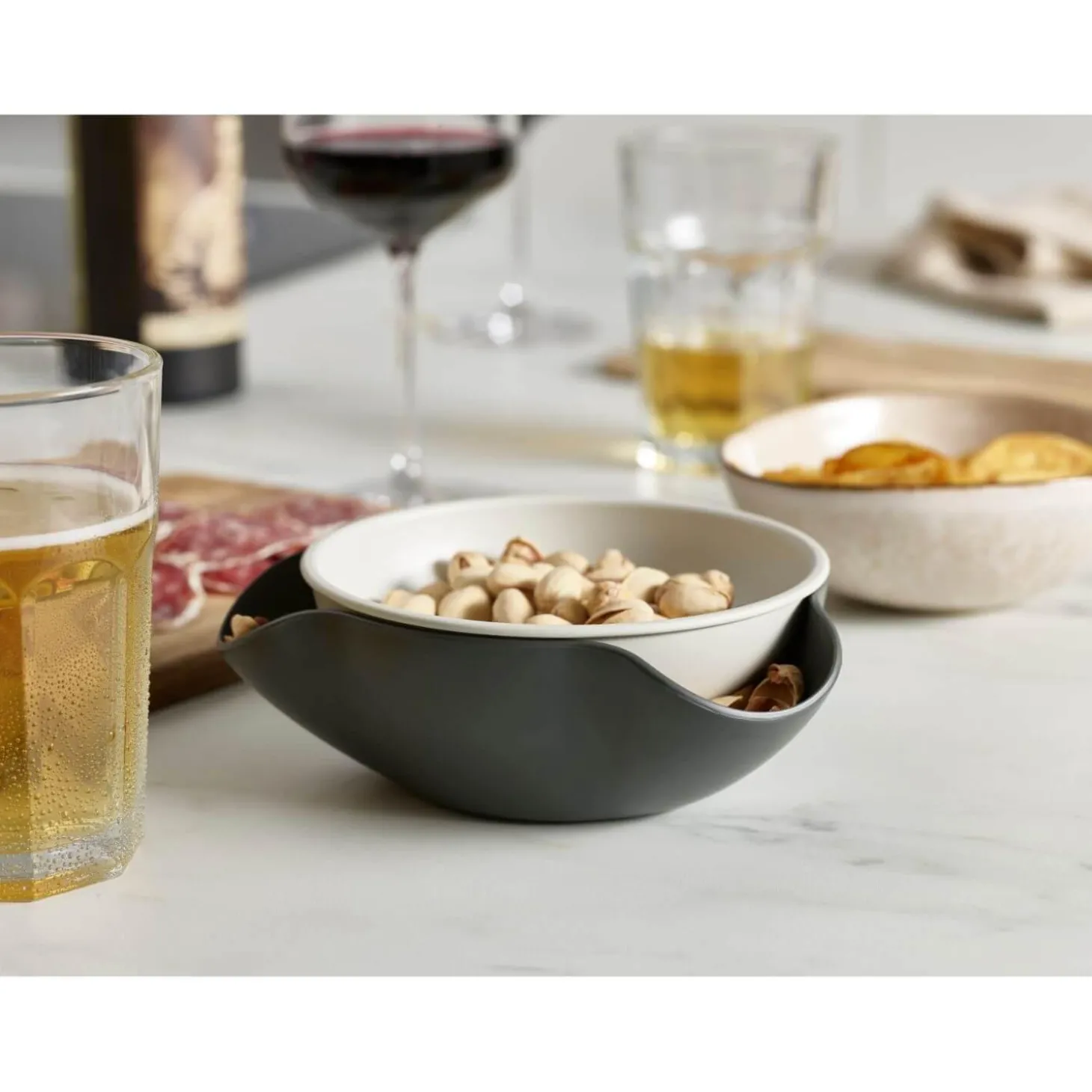 Joseph Joseph presents their uniquely designed Double Dish. This dish is perfect for entertaining and serving treats, the top bowl holds the treats or nuts and the lower bowl is designed with three curved pockets to collect the treat wrappers, nutshells and other waste. The perfect bowl for keeping treat time a mess-free zone.