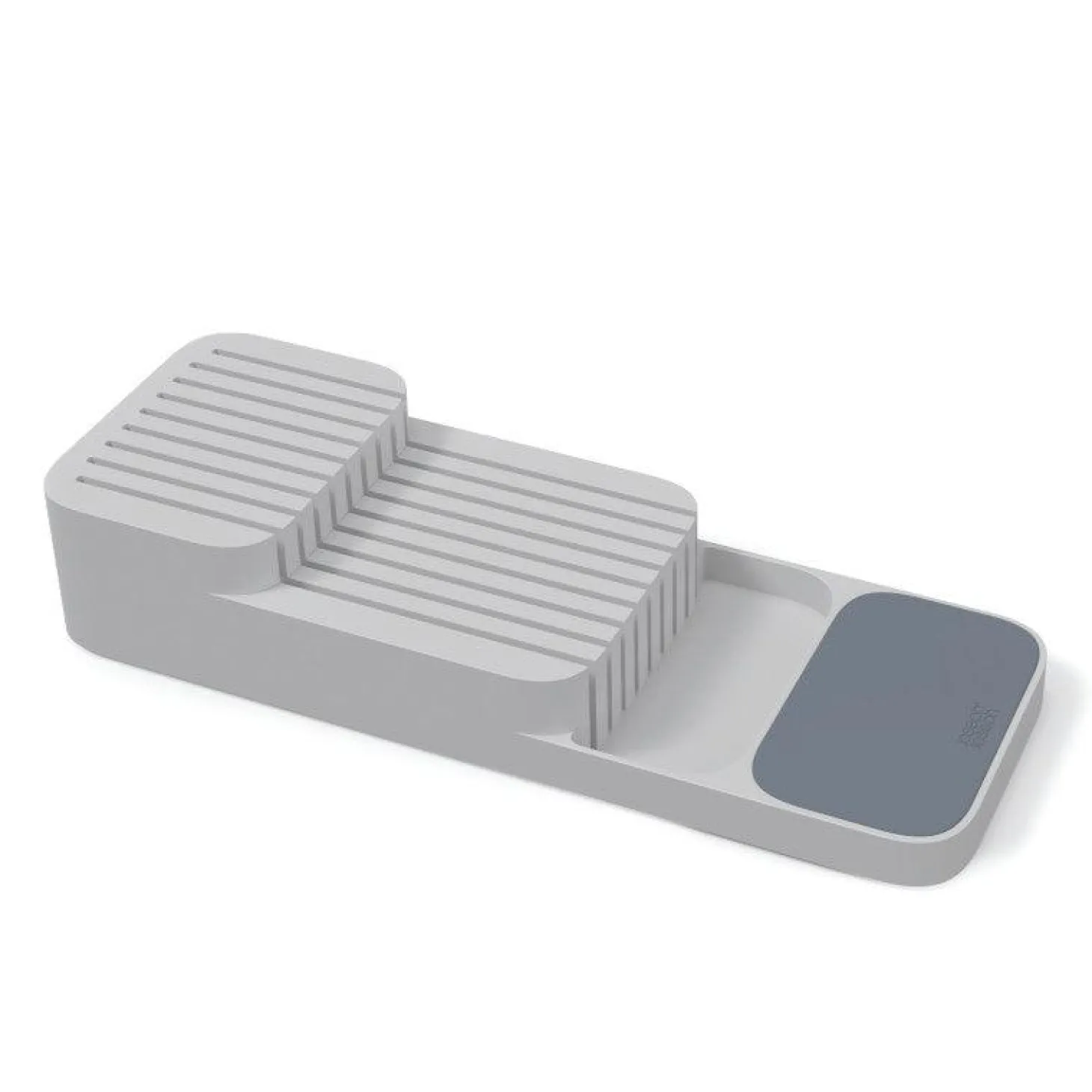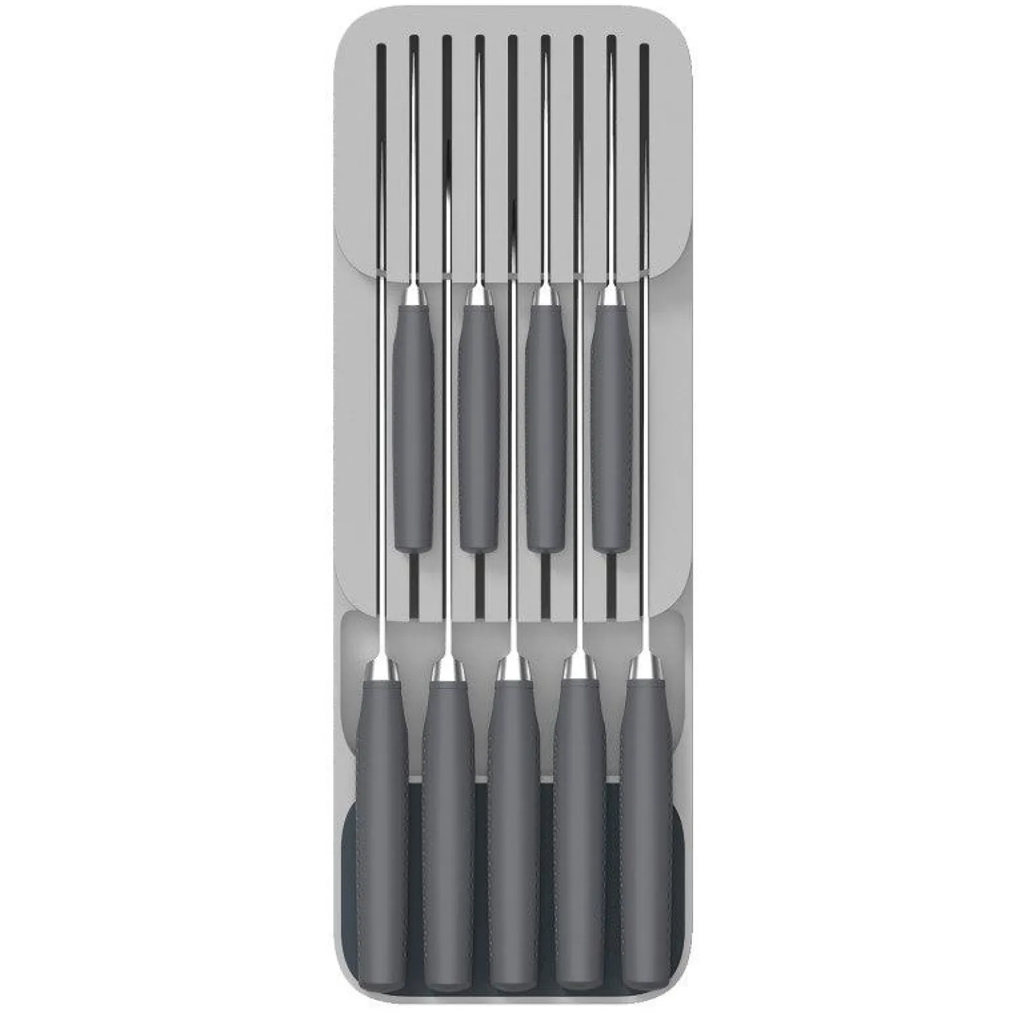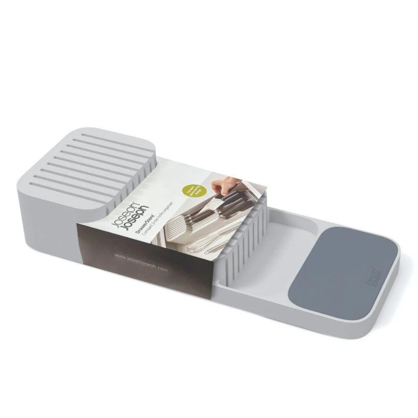 The Joseph Joseph DrawerStore Compact Knife Organiser is ideal for space-challenged kitchens as it is small enough to fit neatly along one side of a standard kitchen drawer, leaving the rest of the drawer free for other bits and pieces. The organiser has 2 tiers, allowing you to safely stack smaller knives on top of larger ones; with the capacity to store up to 9 knives altogether.