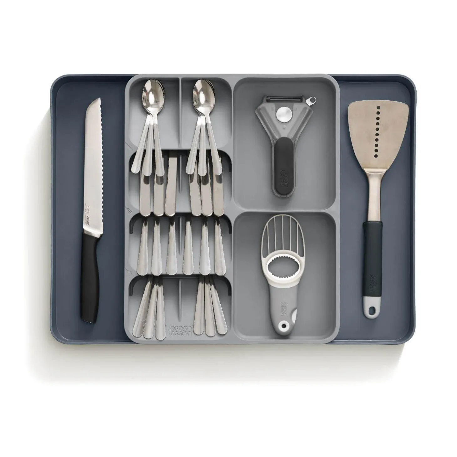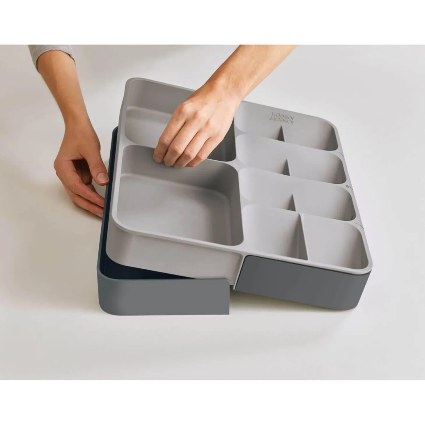 Joseph Joseph can be relied upon to produce good quality innovative products to help you in the kitchen and other rooms in your home, this DrawerStore expanding cutlery tray in grey is ideal for keeping all your cutlery and utensils organised. The cutlery sections are stacked with different compartments for knives, forks and spoons, the two sides can be expanded to make room for your other utensils. A perfect way to keep your cutlery drawer organised.
