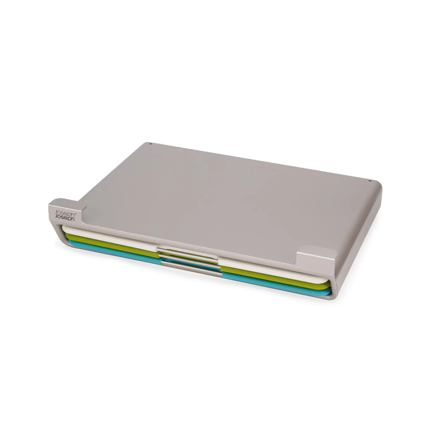 Joseph Joseph presents their Editions Folio Slim Large Chopping Board Set with multi-coloured boards. Featuring three double-sided colour-coded chopping boards, an ideal worktop addition to prevent cross-contamination when preparing different ingredients in the kitchen. With a slimline design for convenient storage and a tiered design for easy selection with each board having stainless steel handles. Each board is designed with safety and convenience in mind, such as a textured surface on each side that is knife-friendly and has non-slip feet which allow for secure use whilst chopping and mincing ingredients.Â