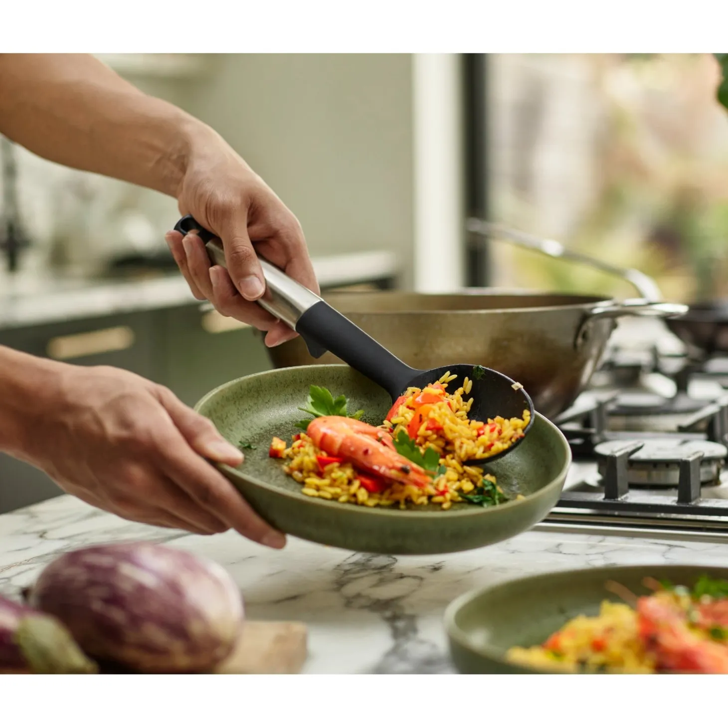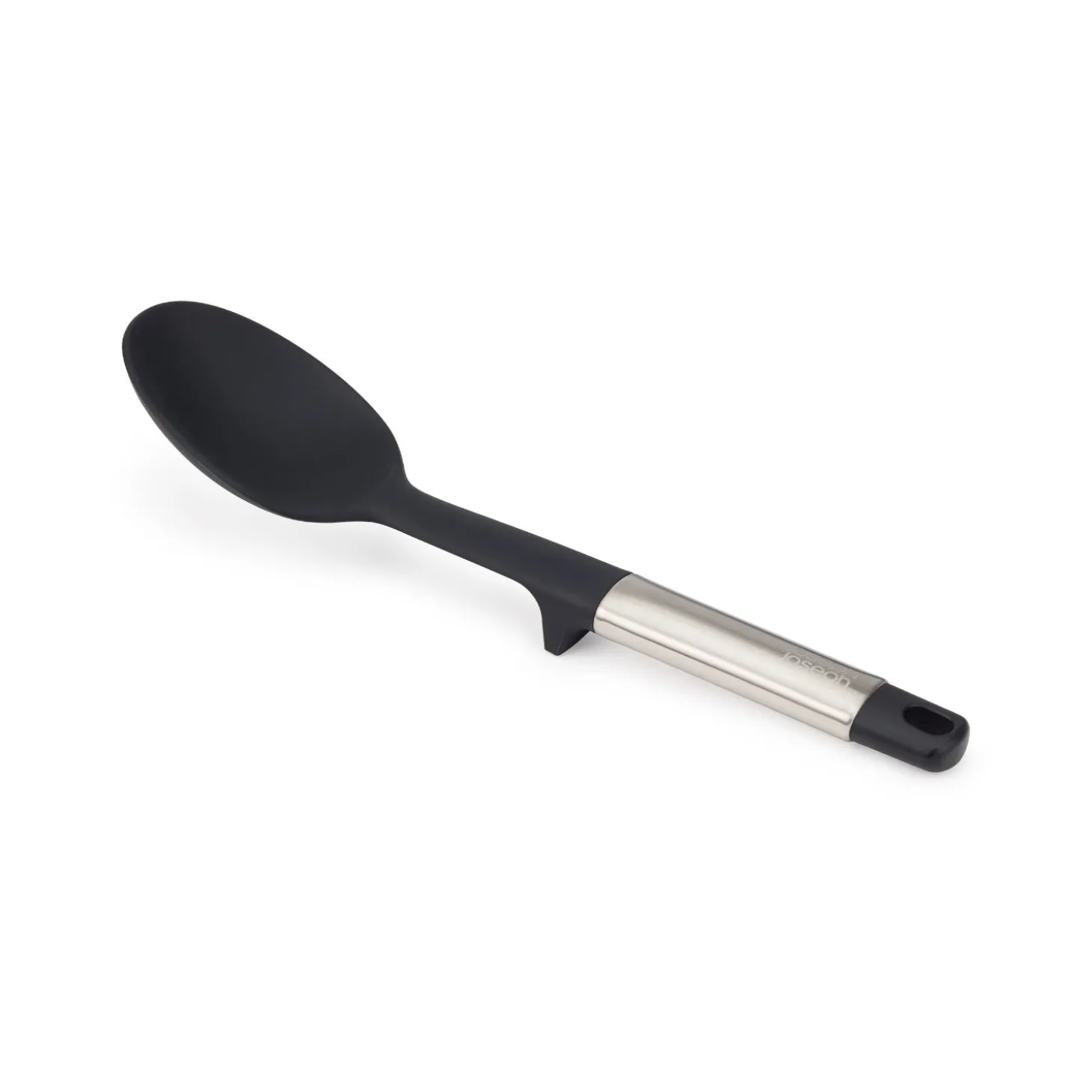 Joseph Joseph, as part of their Elevate range, presents the stainless steel and silicone spoon, the integrated rest and weighted handle allows you to place the spoon onto your countertop without creating a mess and making it a very hygienic utensil. The perfect spoon for stirring your food as you prepare your meals. A great utensil for all cooks kitchens.