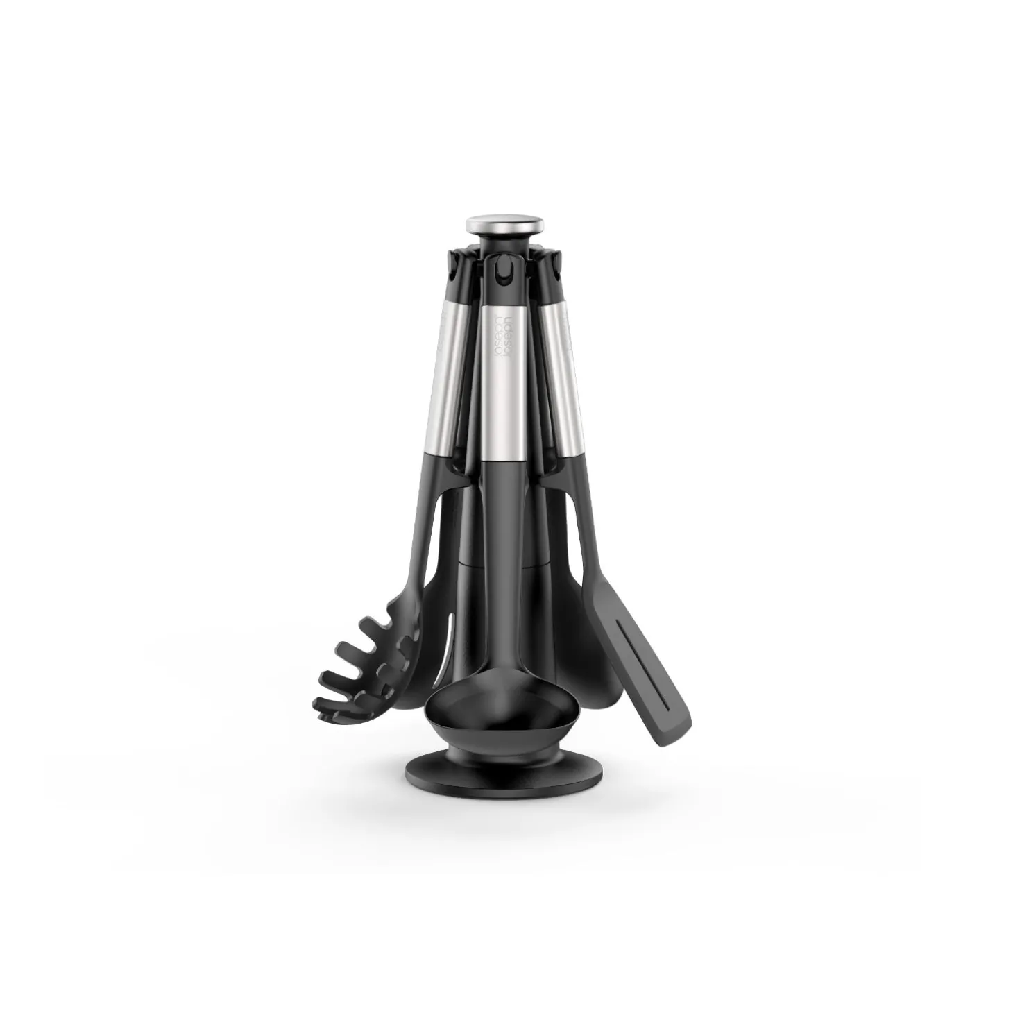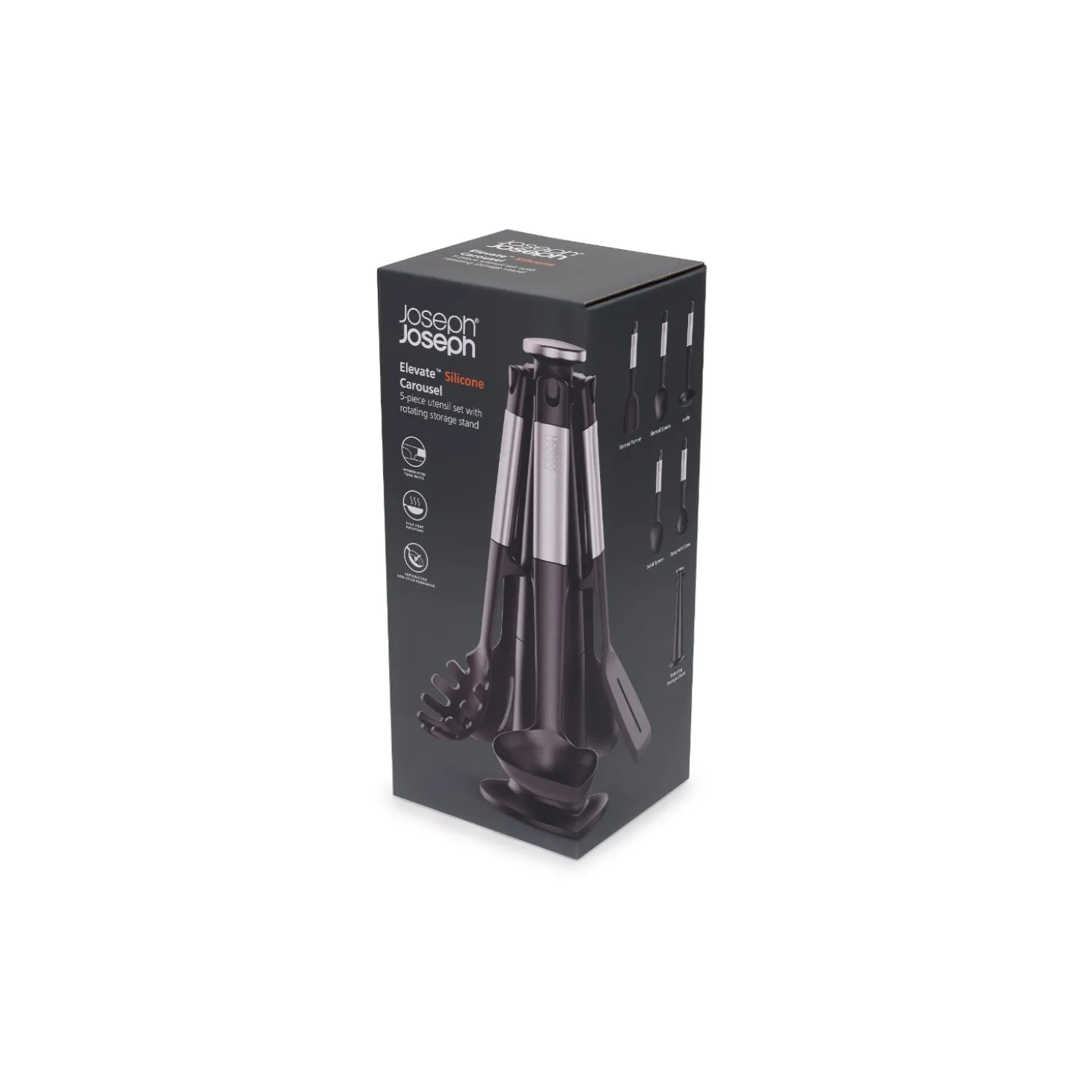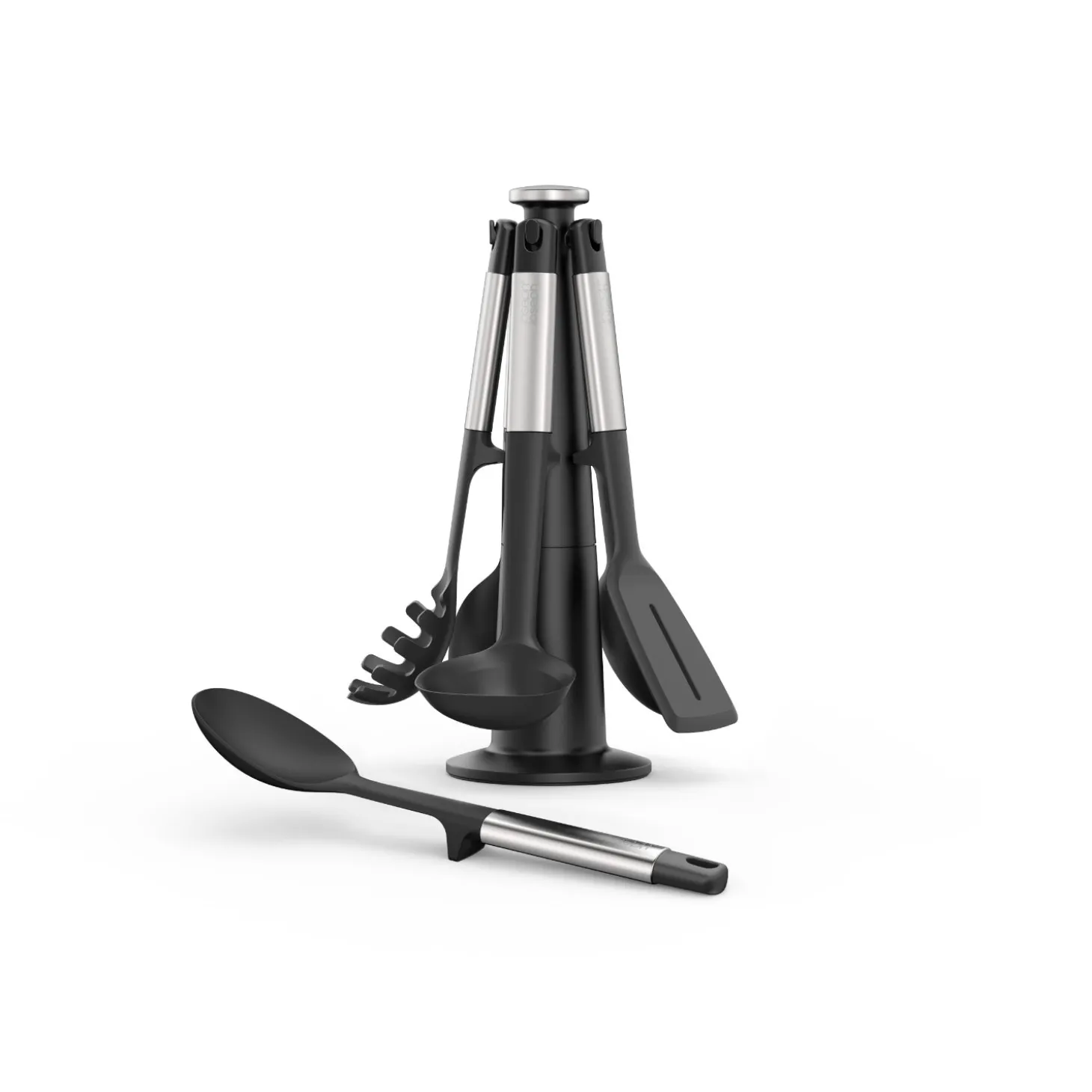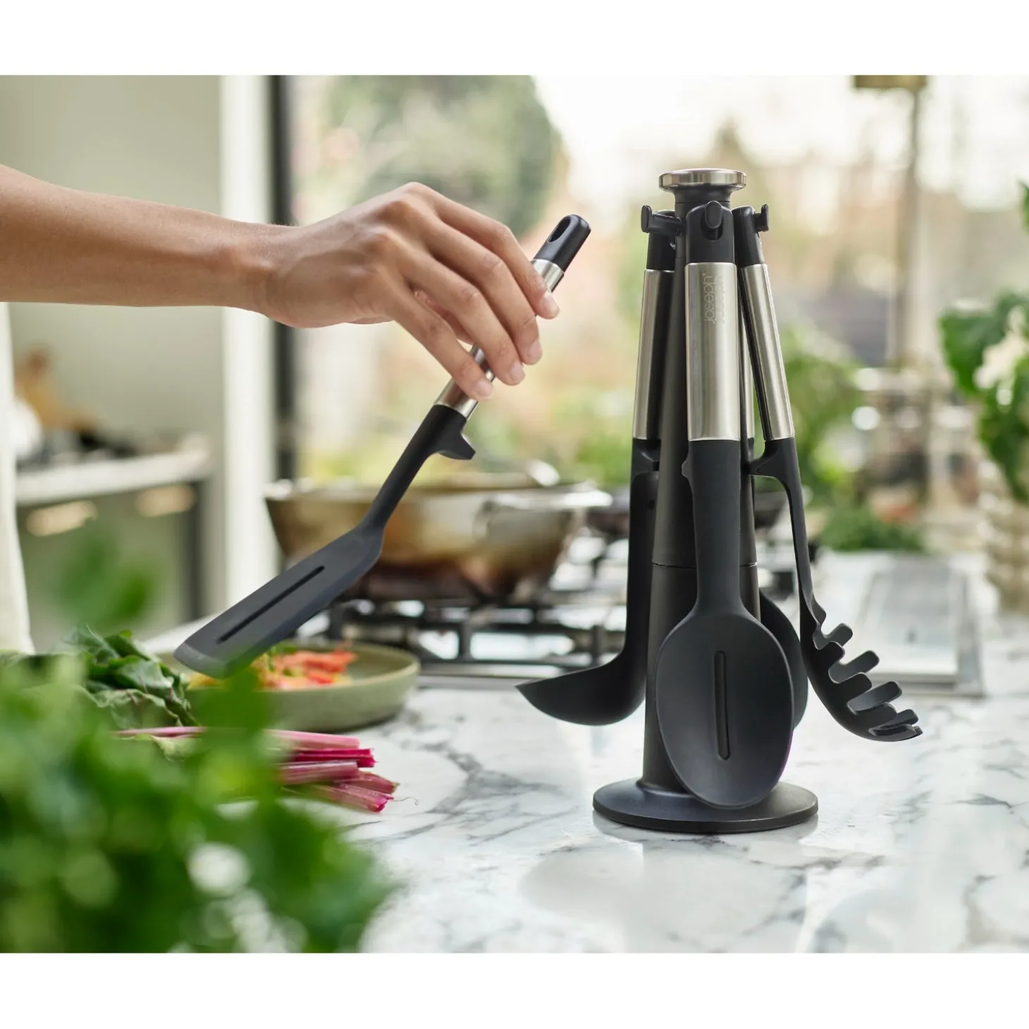 Joseph Joseph presents the 5-Piece Elevate Stainless Steel & Silicone Utensil Set with Storage Stand, these utensils have been designed to incorporate weighted handles with integrated tool rests to allow you to rest them down on your countertop keeping it clean and hygienic. This Elevate set includes a slotted spoon, a solid spoon, a slotted turner, a spaghetti server and a ladle, all of them have silicone heads and ergonomic handles for comfort of use. The carousel rotates easily for you to be able to select the utensil you need whilst cooking. A great utensil set for all cooks kitchens.
