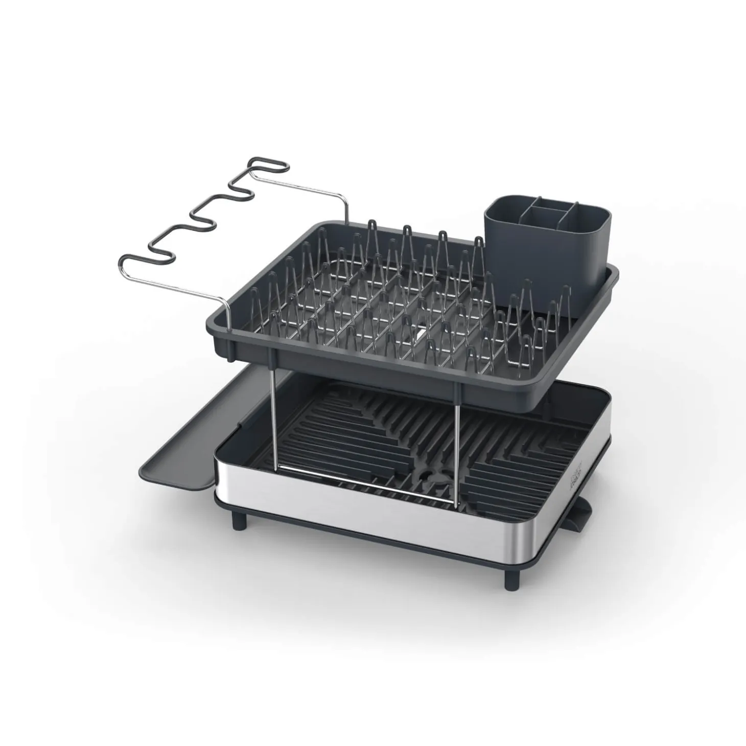 Joseph Joseph presents the Excel 2-Tier Steel Dish Rack in Grey and Stainless Steel, this great rack offers plenty of draining space but feeling compact at the same time and not crowding your sink area, it has an integrated drip tray underneath the built-in wine glass holder, enabling them to dry safely. The large capacity gives you plenty of room for all your crockery and dishes, the fast-draining design with its raised ribs prevents water from collecting underneath mugs or bowls. A great dish rack for all kitchens.Â