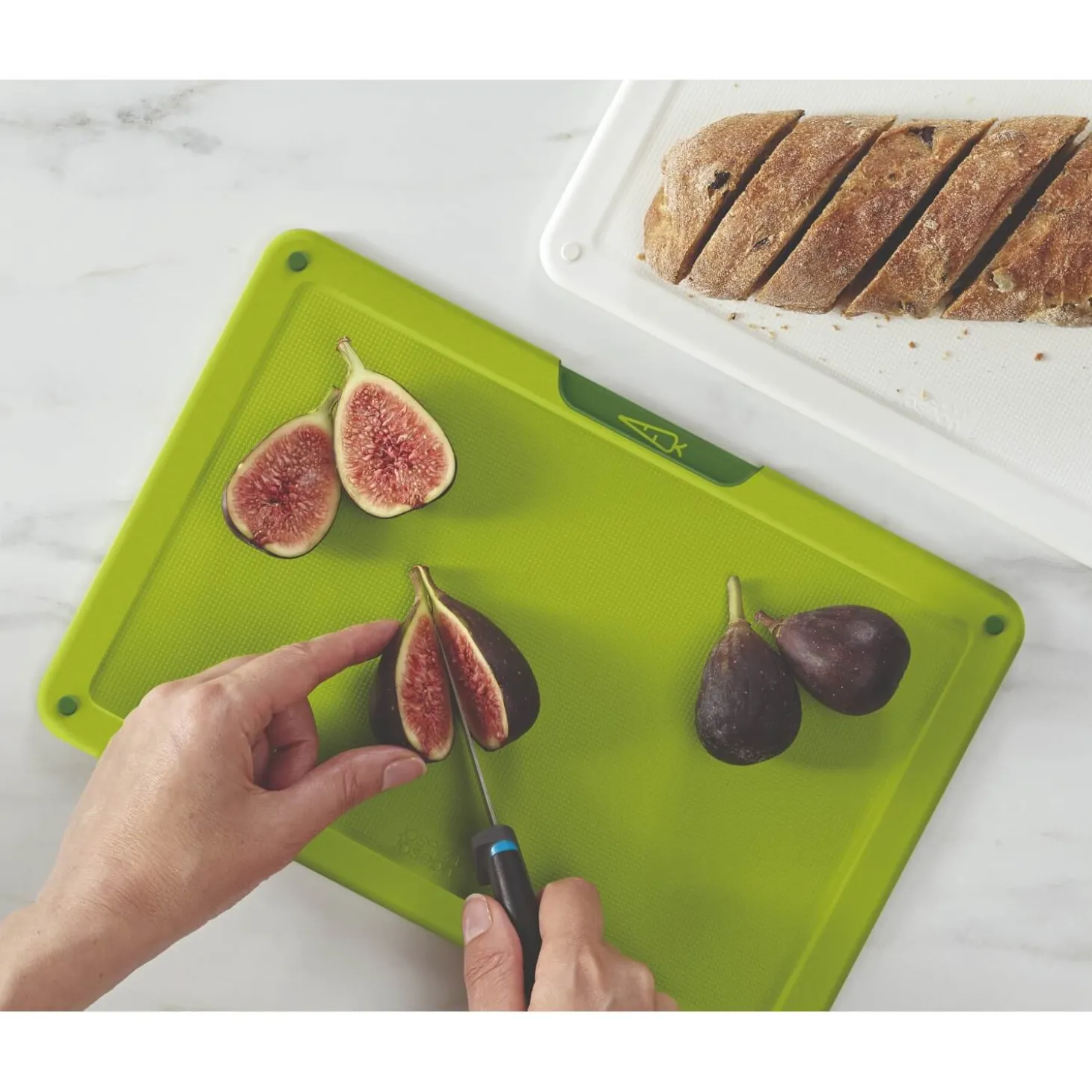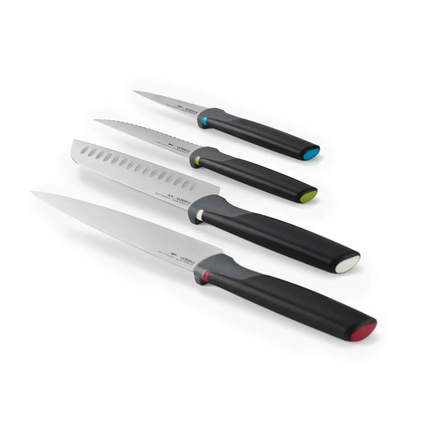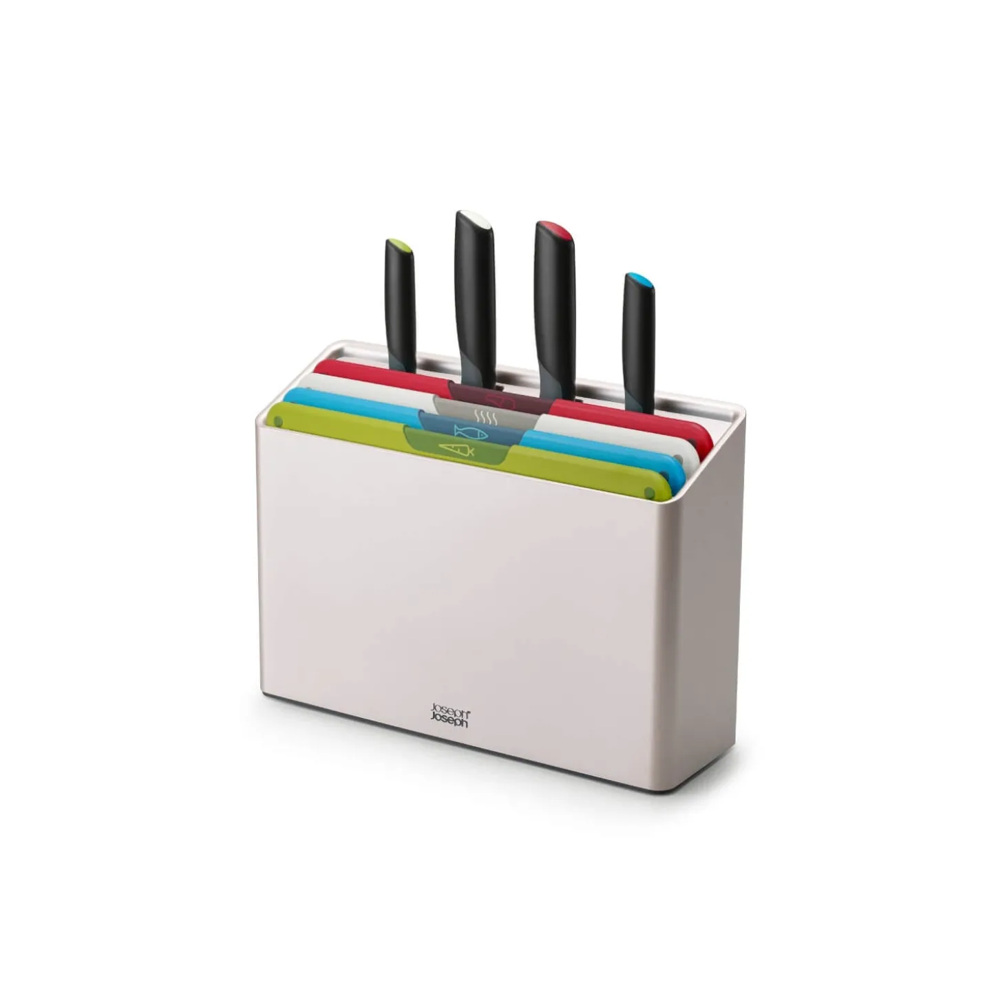 Joseph Joseph presents the Folio Icon Plus 8-Piece Knife & Chopping Board Set. The cleverly designed weighted handles keep the blades of the knives raised above the work surface when you place them there, keeping your countertop clean and hygienic. The blades are made of Japanese stainless steel to ensure sharp cutting edges for easy cutting and are colour-coded to match a food-specific board. An excellent set for all cooks to have in their kitchen.