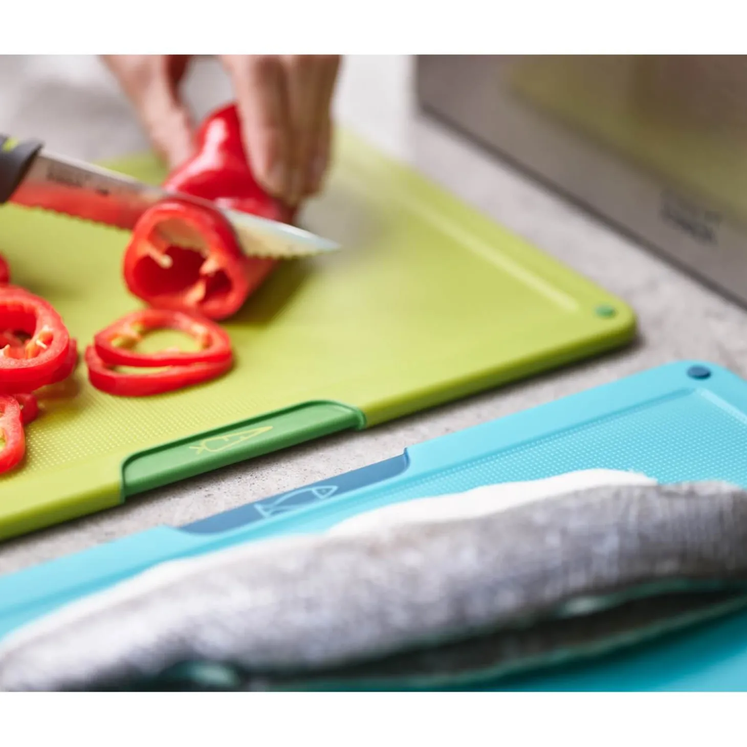 Joseph Joseph presents their Folio Icon Steel Chopping Board Set. Featuring four double-sided colour-coded chopping boards, an ideal worktop addition to prevent cross-contamination when preparing different ingredients in the kitchen. With a slimline design for convenient storage and a tiered design for easy selection with each board having colour-coded handles. Each board is designed with safety and convenience in mind, such as a textured surface on each side that is knife-friendly and are non-slip which allow for secure use whilst chopping and mincing ingredients.Â