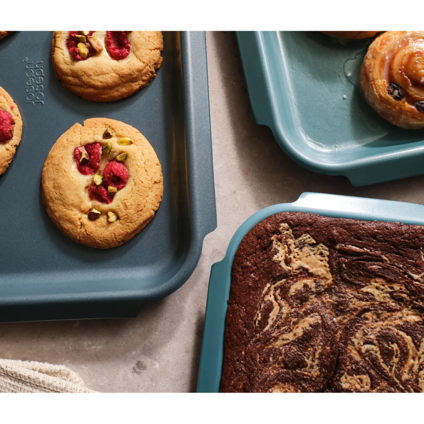 Joseph Joseph presents the Medium Non-Stick Baking Tray in Blue, a standout piece from their innovative Nest™ Bake Oven range. Designed with handles on all sides, it ensures a secure and comfortable grip when lifting from a hot oven, even while wearing oven gloves. What truly sets this tray apart is its clever nesting feature, enabling it to stack seamlessly with others in the collection, saving precious storage space and keeping your kitchen organised.