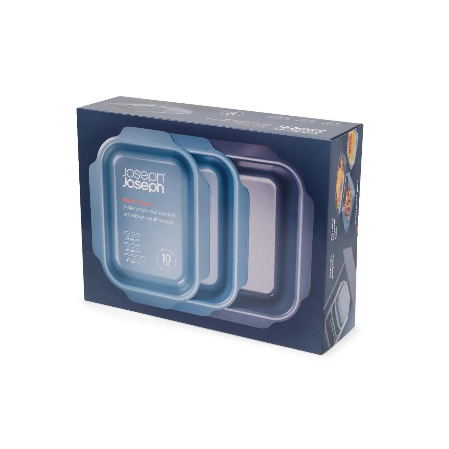 Joseph Joseph presents the Set of 3 Roasting Trays, a standout piece from their innovative Nest™ Oven range. These trays are designed with handles on all sides, ensuring a secure grip when lifting them from a hot oven while wearing oven gloves. What sets these roasting trays apart is their ingenious nesting feature, allowing them to seamlessly stack together and saving valuable storage space.
