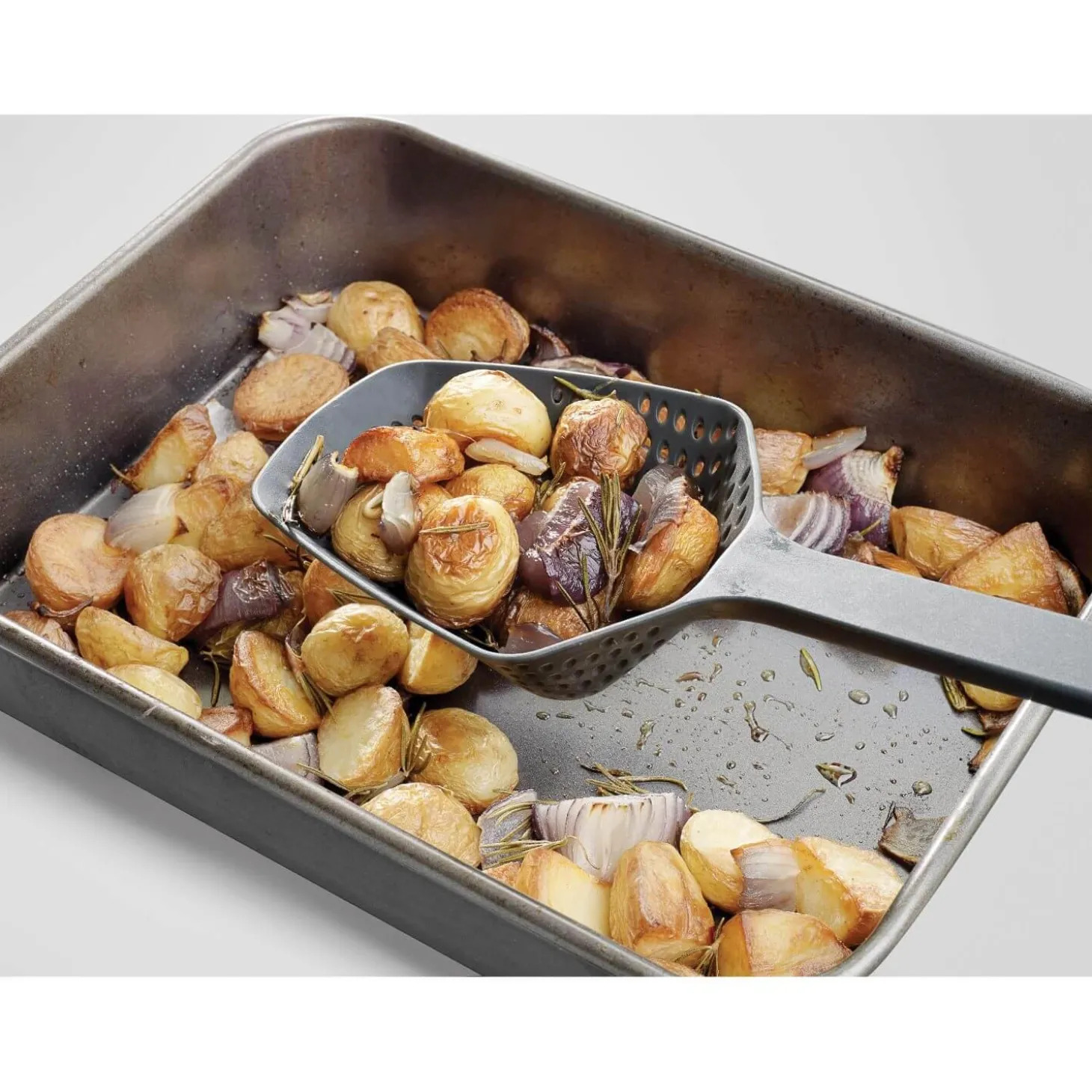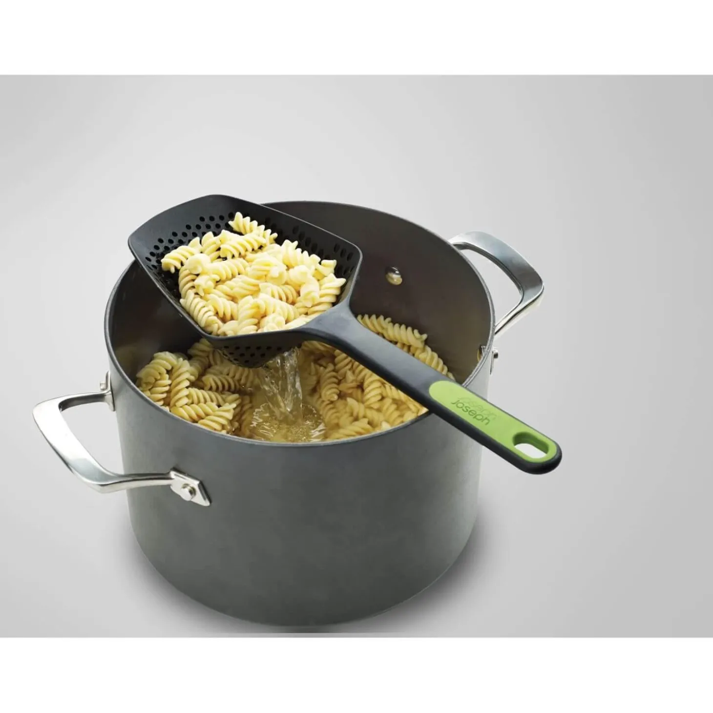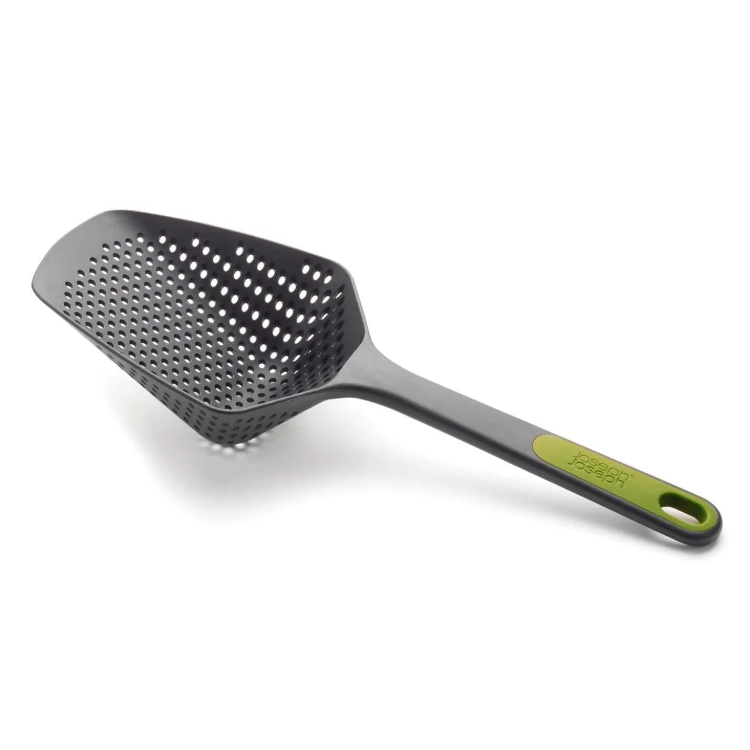 Joseph Joseph presents their Scoop Plus Colander, just perfect for scooping and draining from a hot pan or baking tray. The Scoop is made from a toughened nylon, it has hooks allowing you to rest the scoop on the side of a pan allowing the contents to drain, perfect for vegetables, fried food and pasta. This Joseph Joseph scoop is suitable for non-stick cookware and is heat resistant up to 200°C / 392°F. A great gadget to add to your utensil drawer.