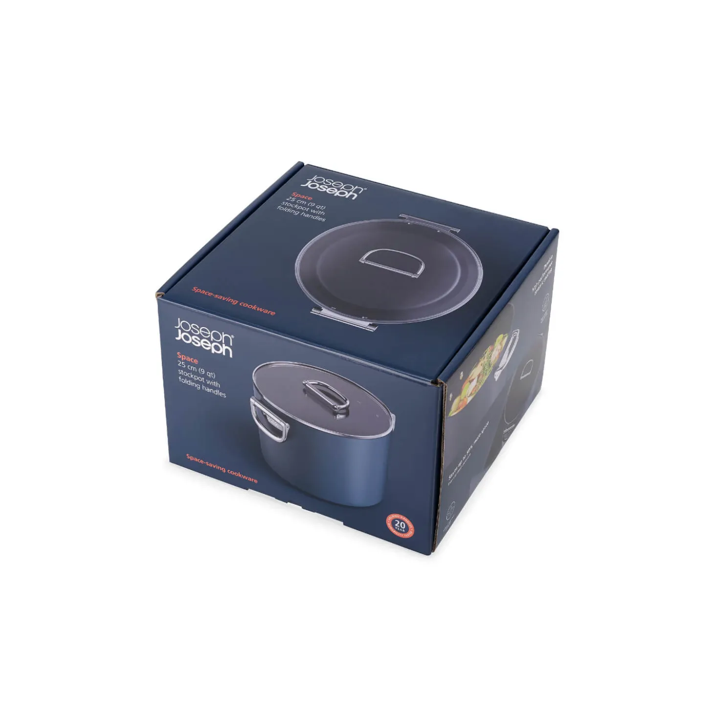 Joseph Joseph presents the 25cm Non-Stick Folding Handle Stock Pot and Lid in Midnight Blue from their innovative new range ‘Space’. This fantastic pot is designed with space-saving in mind, with its foldable handles which enable effortless organisation, it is perfect for trouble-free, convenient storage. Built to withstand even the most demanding recipes when cooking in the kitchen, it is hard-wearing with a thick construction and has a strong scratch-resistant coating for easy care. Moreover, the base heats and cooks evenly, providing exceptional results and a dependable cooking experience. The perfectly engineered stock pot, designed to meet the demands of even the busiest kitchens.