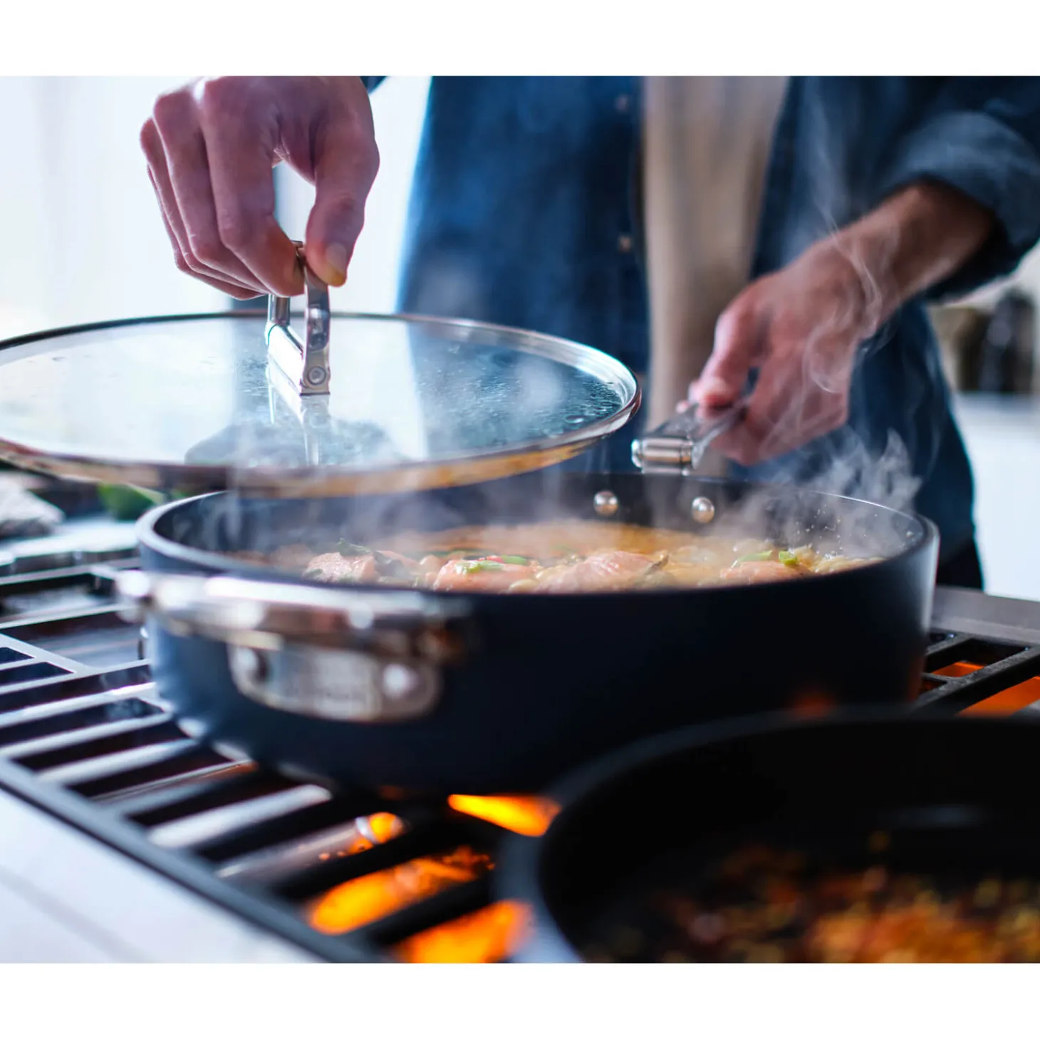 Joseph Joseph presents the 28cm Non-Stick Folding Handle Saute Pan and Lid in Midnight Blue from their innovative new range ‘Space’. This fantastic pan is designed with space-saving in mind, with its unique foldable handle which enables effortless organisation, it is perfect for trouble-free, convenient storage. Built to withstand even the most demanding recipes when cooking in the kitchen, it is hard-wearing with a thick construction and has a strong scratch-resistant coating for easy care. Moreover, the base heats and cooks evenly, providing exceptional results and a dependable cooking experience. The perfectly engineered saute pan, designed to meet the demands of even the busiest kitchens.