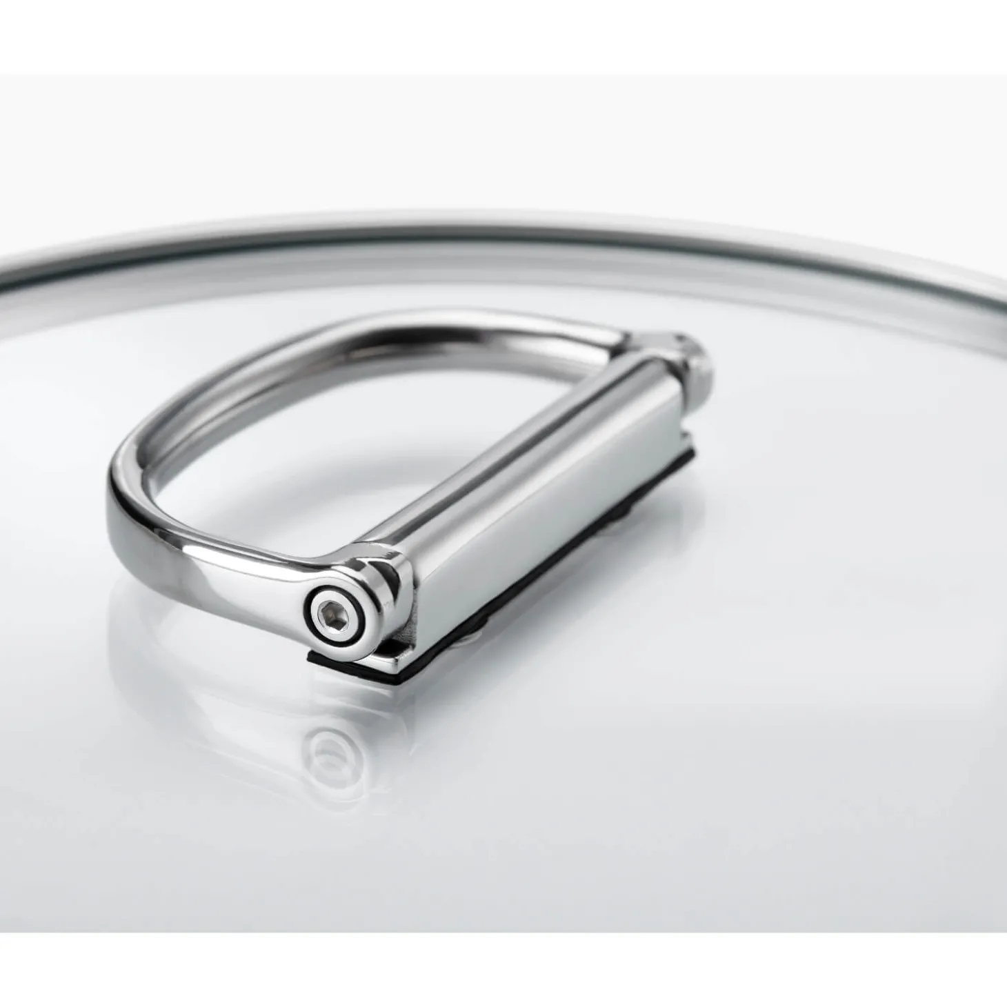- Features a tempered glass lid with folding stainless-steel helper handle