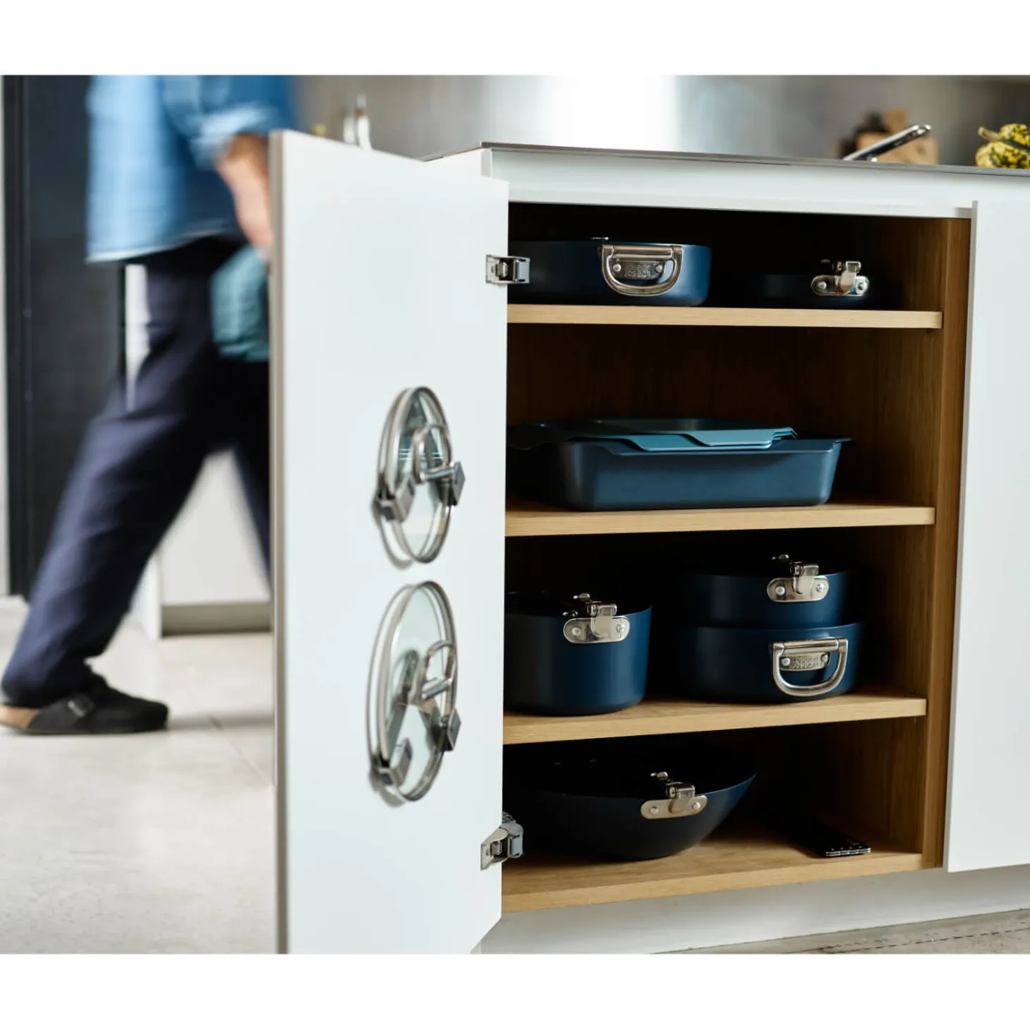 Joseph Joseph presents the 28cm Non-Stick Folding Handle Shallow Casserole Pan and Lid in Midnight Blue from their innovative new range ‘Space’. This fantastic pan is designed with space-saving in mind, with its foldable handles which enable effortless organisation, it is perfect for trouble-free, convenient storage. Built to withstand even the most demanding recipes when cooking in the kitchen, it is hard-wearing with a thick construction and has a strong scratch-resistant coating for easy care. Moreover, the base heats and cooks evenly, providing exceptional results and a dependable cooking experience. The perfectly engineered casserole pan, designed to meet the demands of even the busiest kitchens.